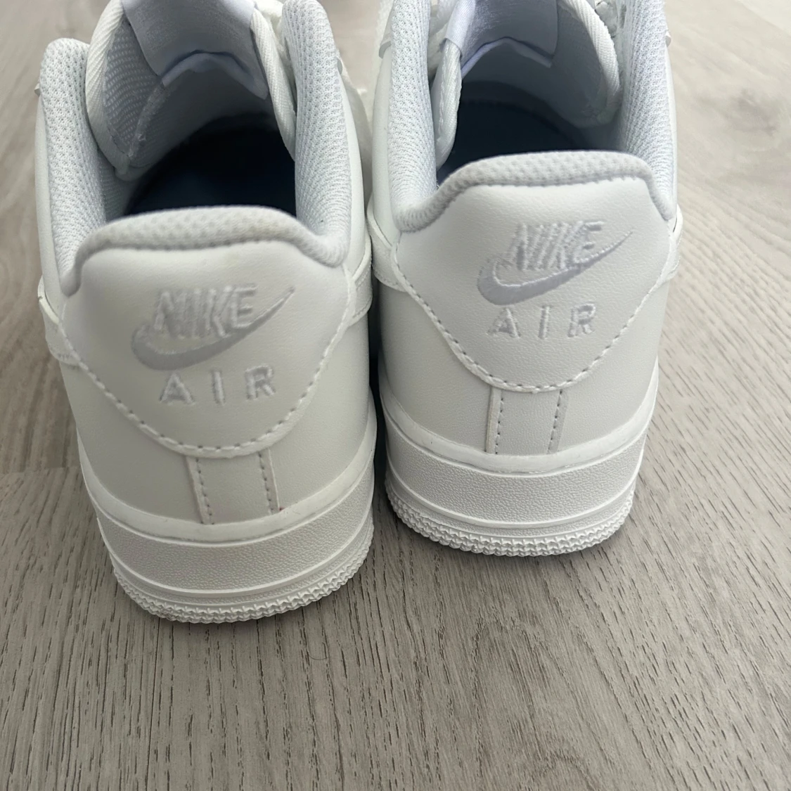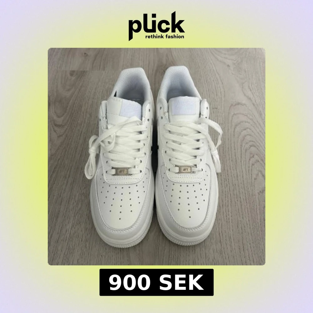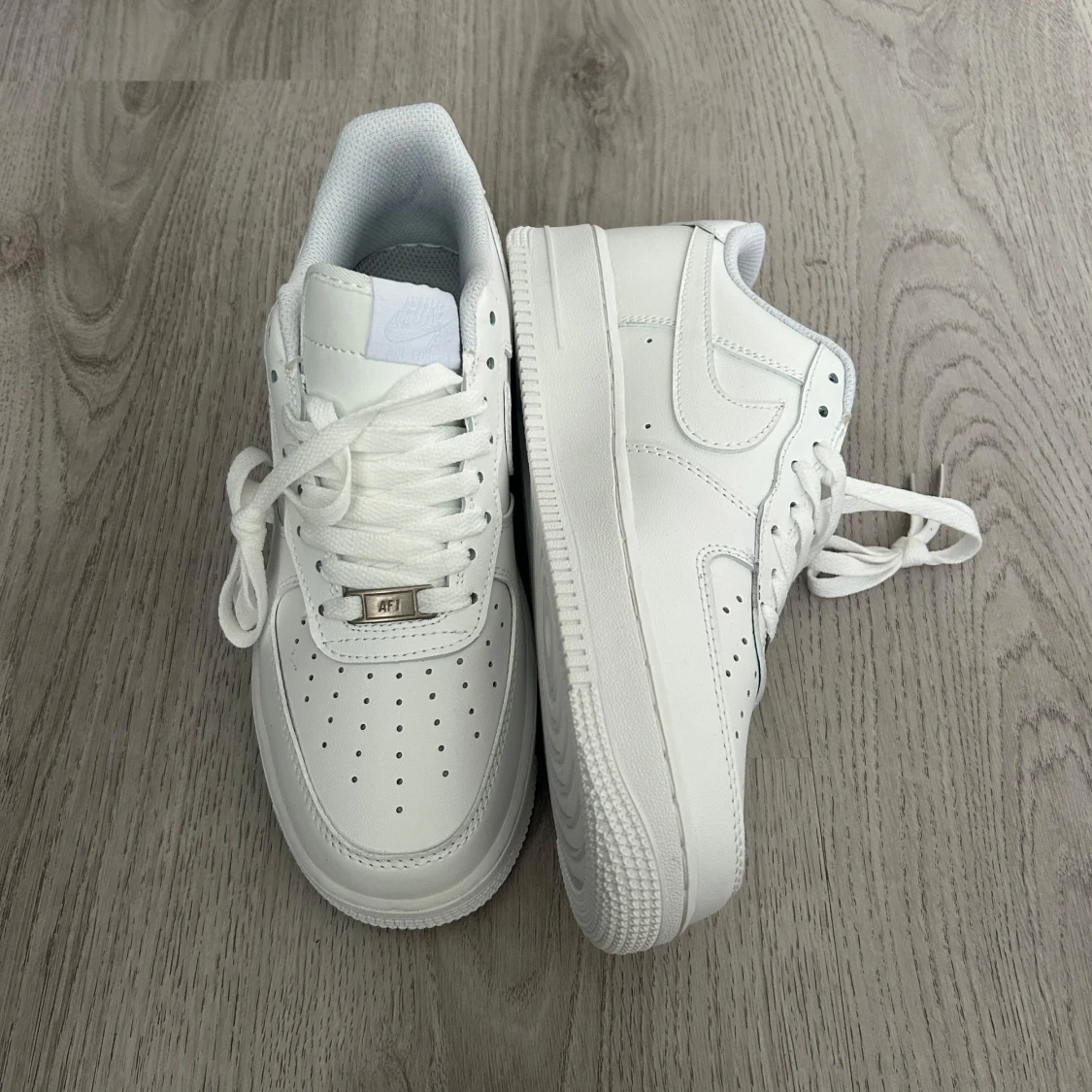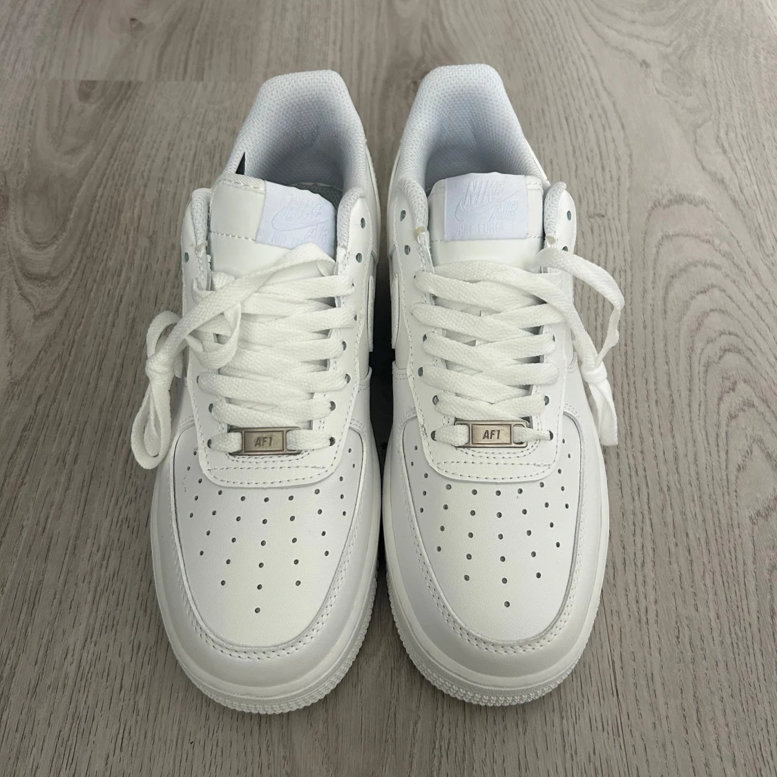 Helt nya klassiska helvita Nike Air Force 1 sneakers med perforerad tå, snörning och låg profil. Skorna har Nike-logga på sidan och bak, samt en platt sula för skön komfort. Perfekta för en clean och stilren look.