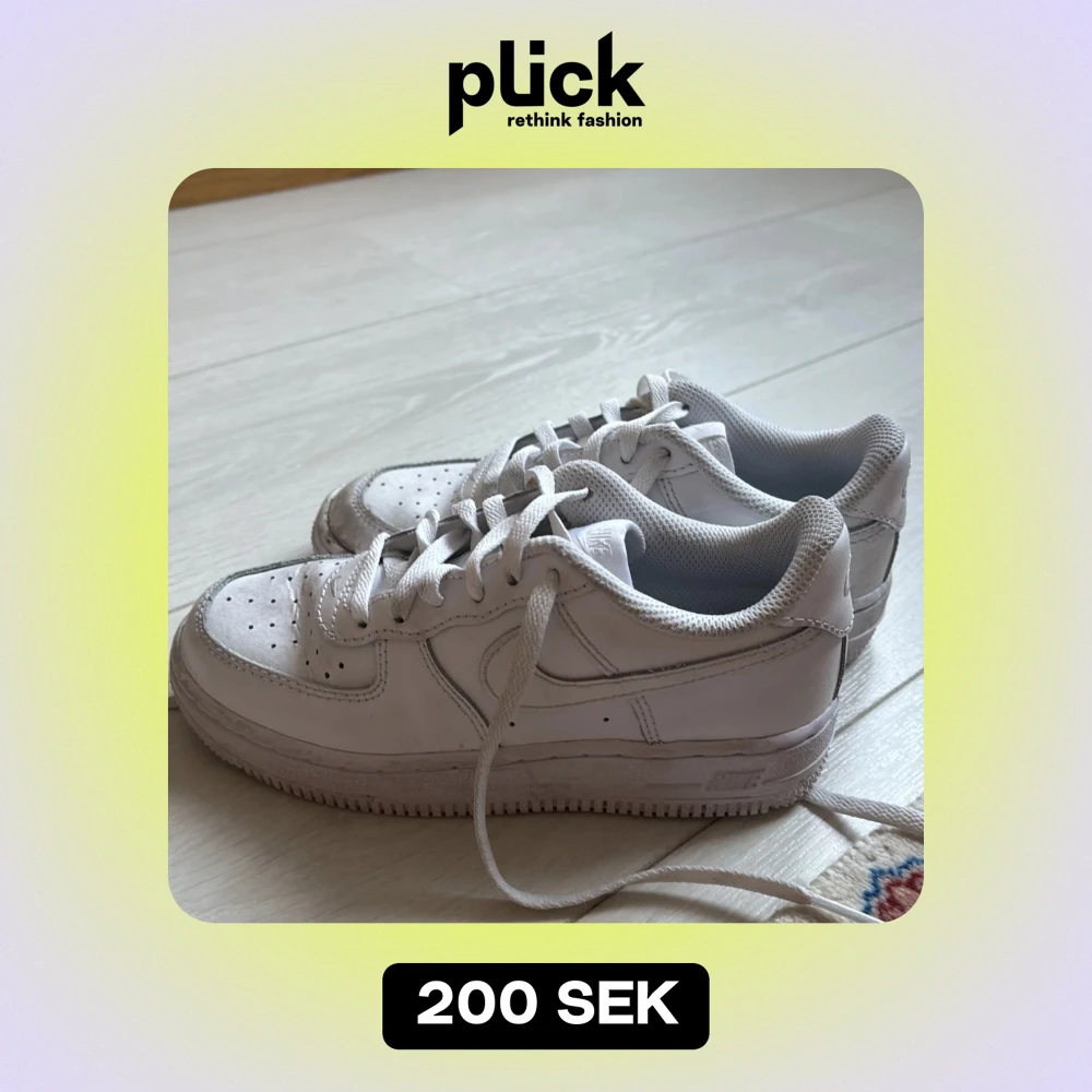 Säljer ett par klassiska vita Nike Air Force sneakers i bra skick. De har en stilren design med snörning och är perfekta för vardagsbruk. Skorna är bekväma och passar till det mesta i garderoben. Perfekta för både vår och sommar! Skorna är i storlek 30 och är knappast använda.