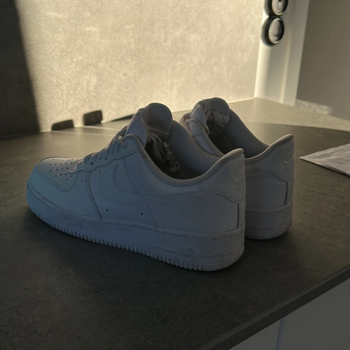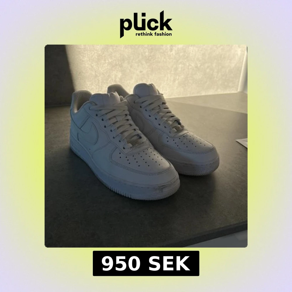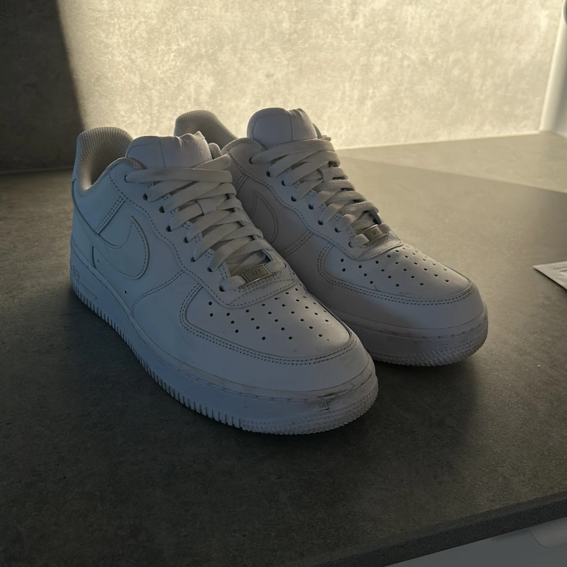 Säljer ett par klassiska vita Nike Air Force sneakers. De har en stilren design med snörning och perforerade detaljer på ovansidan för ventilation. Perfekta för en avslappnad och trendig look. Använd max 5 gånger så är i väldigt bra skick, låda och crease skydd följer med, pris kan diskuteras vid snabb affär.