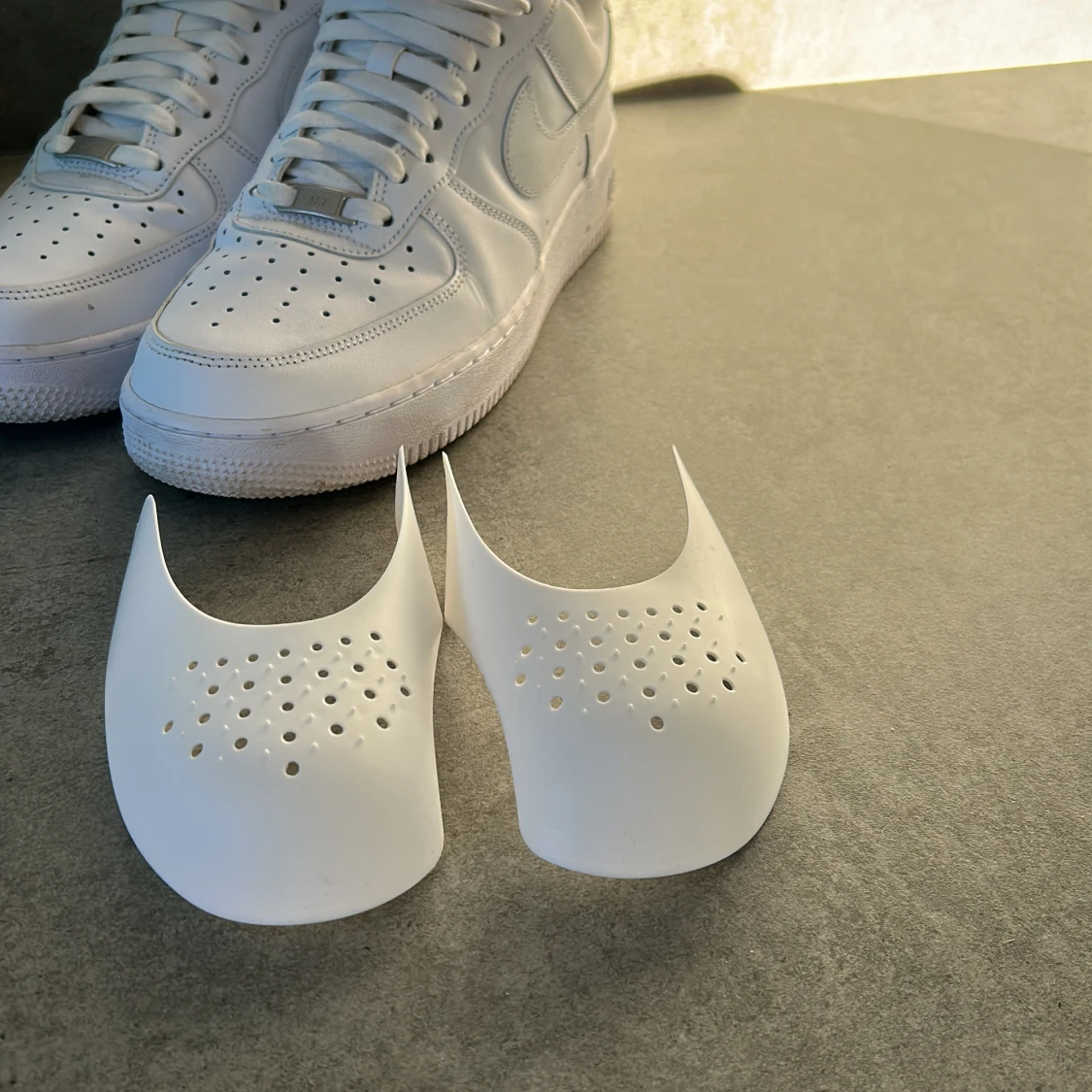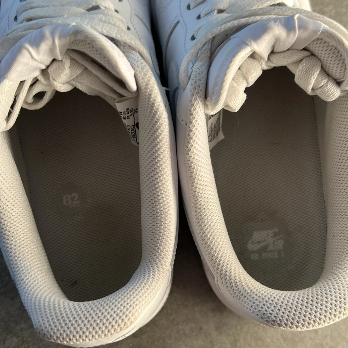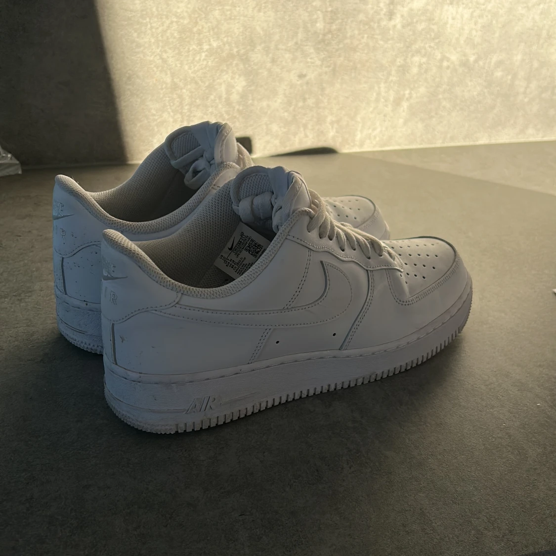 Säljer ett par klassiska vita Nike Air Force sneakers. De har en stilren design med snörning och perforerade detaljer på ovansidan för ventilation. Perfekta för en avslappnad och trendig look. Använd max 5 gånger så är i väldigt bra skick, låda och crease skydd följer med, pris kan diskuteras vid snabb affär.