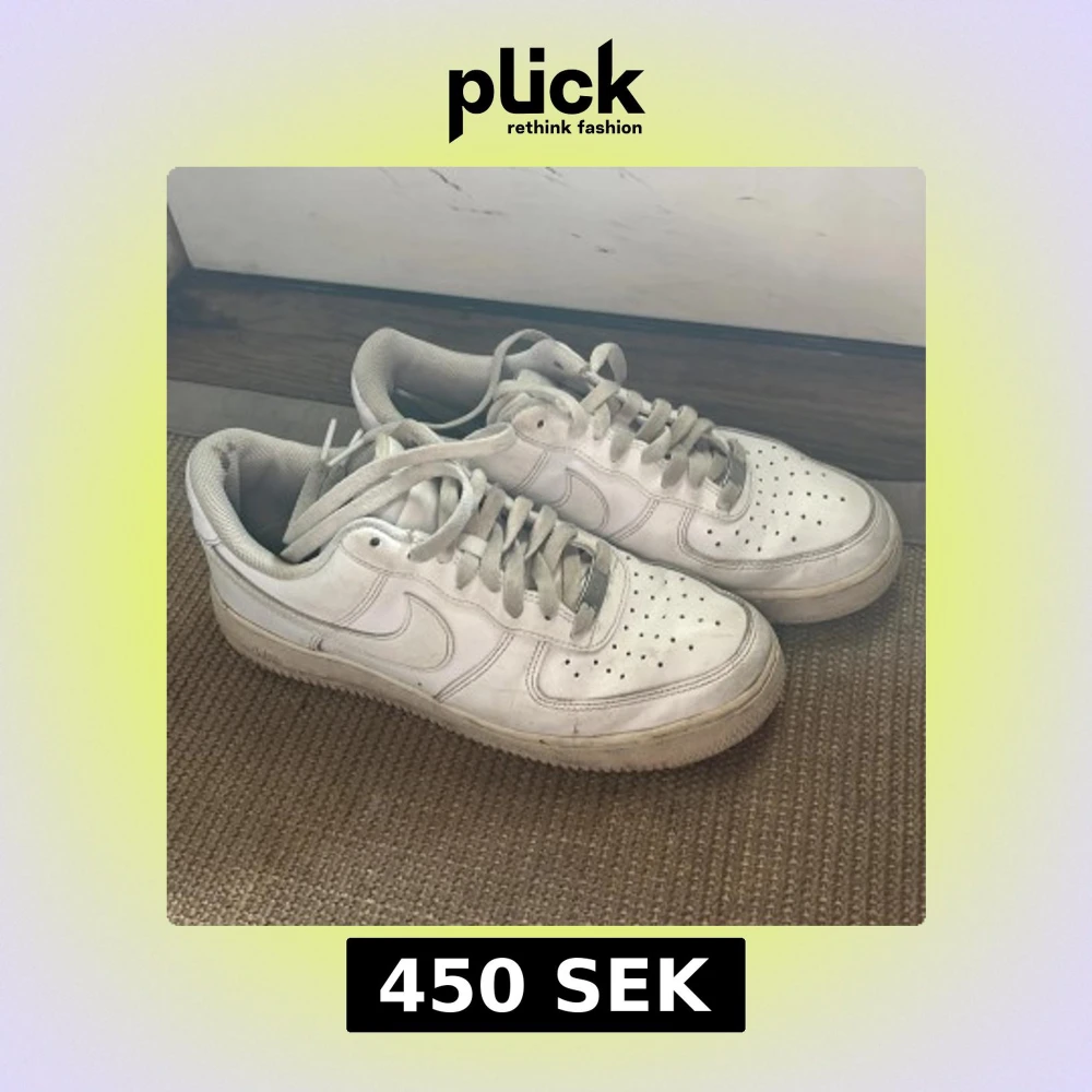 Säljer ett par klassiska vita Nike Air Force sneakers. Skorna har en rund tå och snörning framtill. Perfekta för en stilren look.