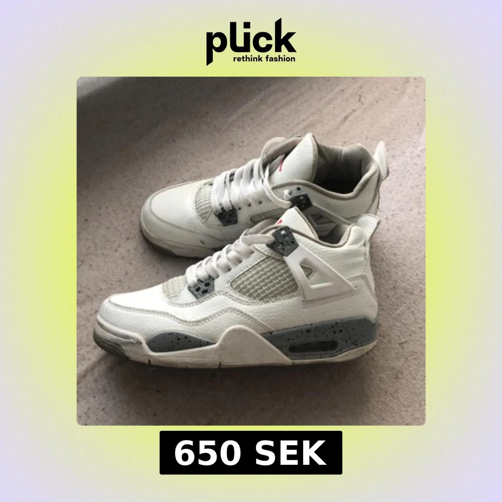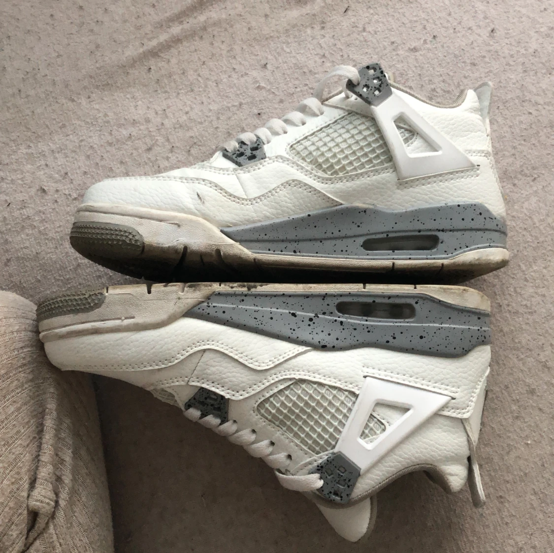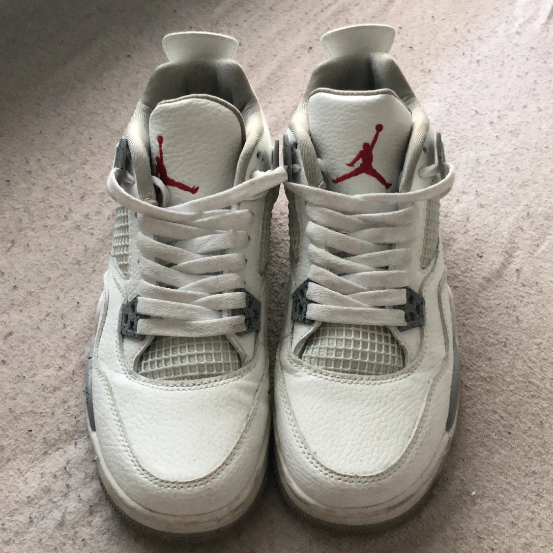 Säljer ett par klassiska Nike Air Jordans 4 Retro i vitt med grå och svarta detaljer samt röd Jumpman-logga på plösen. Skorna har nätpaneler på sidorna, snörning och en robust sula med synlig luftdämpning.