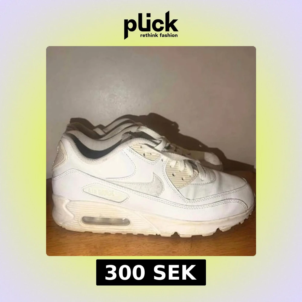 Säljer ett par klassiska Nike Air Max 90 sneakers i helvitt. Skorna har en chunky sula med synlig Air Max-dämpning, snörning och rund tå. Perfekta för dig som gillar en clean och sportig look. Materialet är en mix av skinn och syntet.