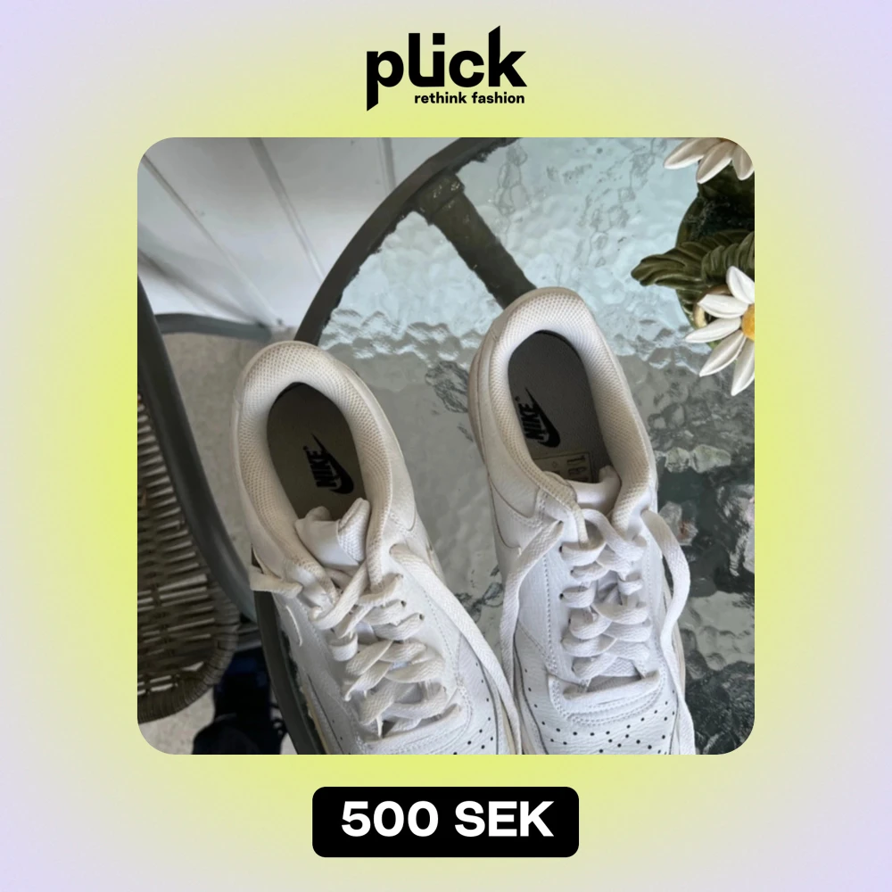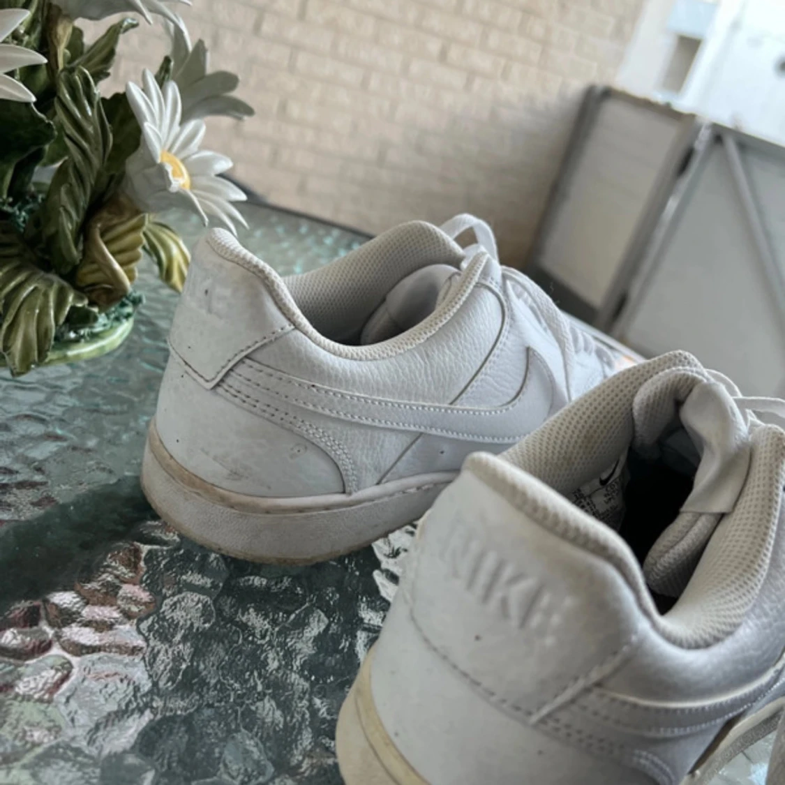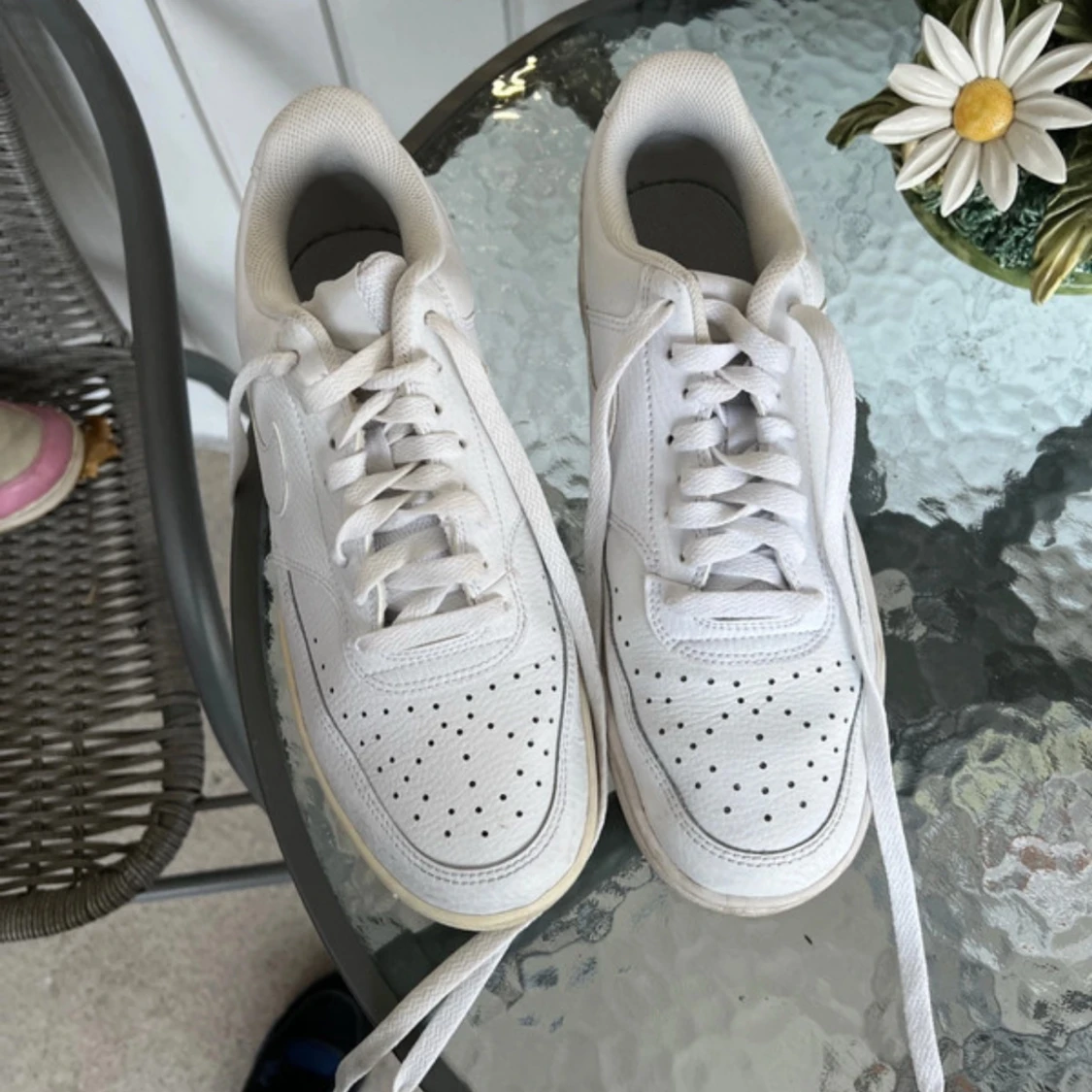 Säljer ett par vita Nike sneakers i bra skick. De har en klassisk design med snörning och perforerade detaljer på ovansidan för ventilation. Perfekta för vardagsbruk och ger en stilren look. Lite slitna på sulan men fortfarande i gott skick.