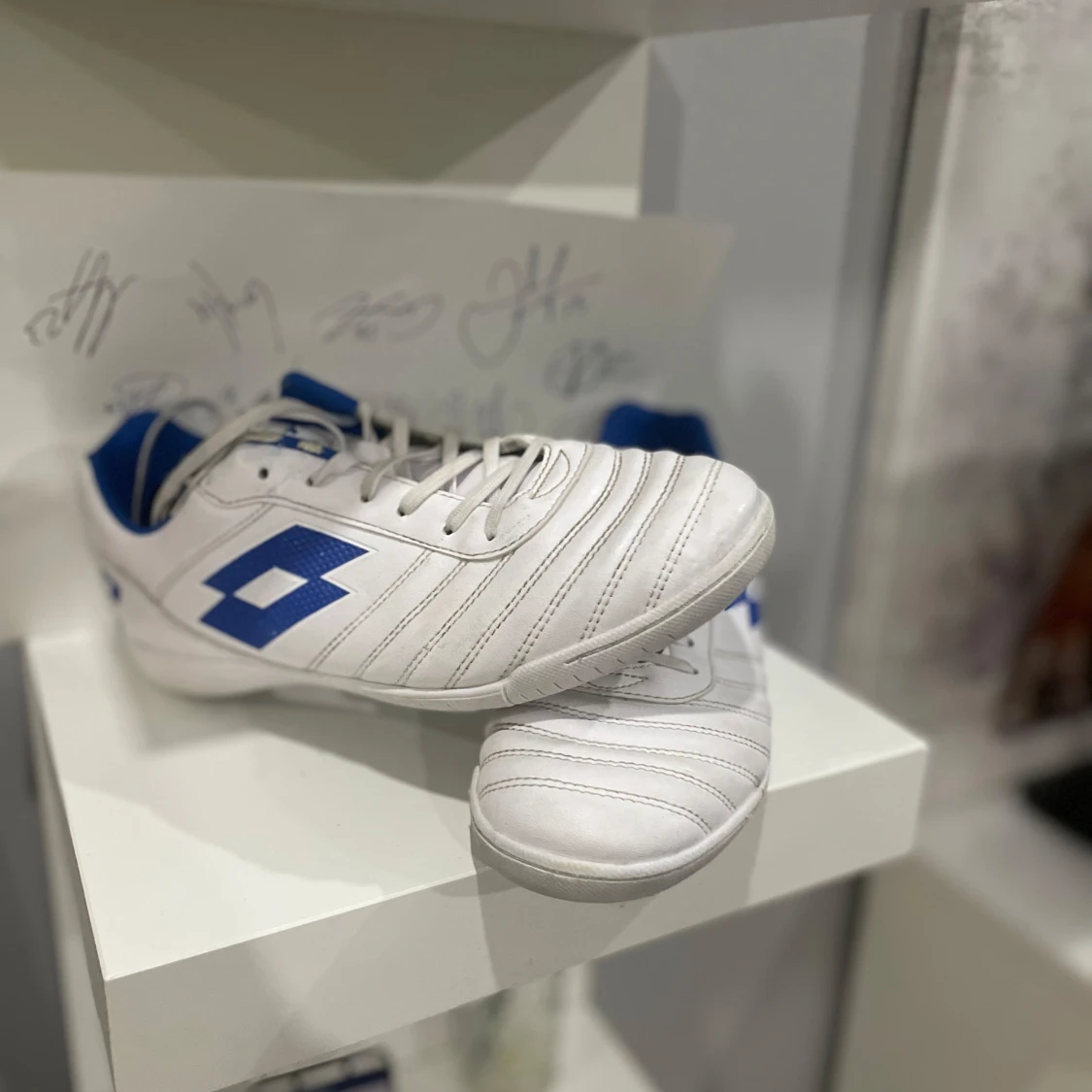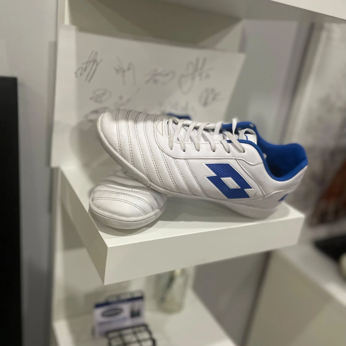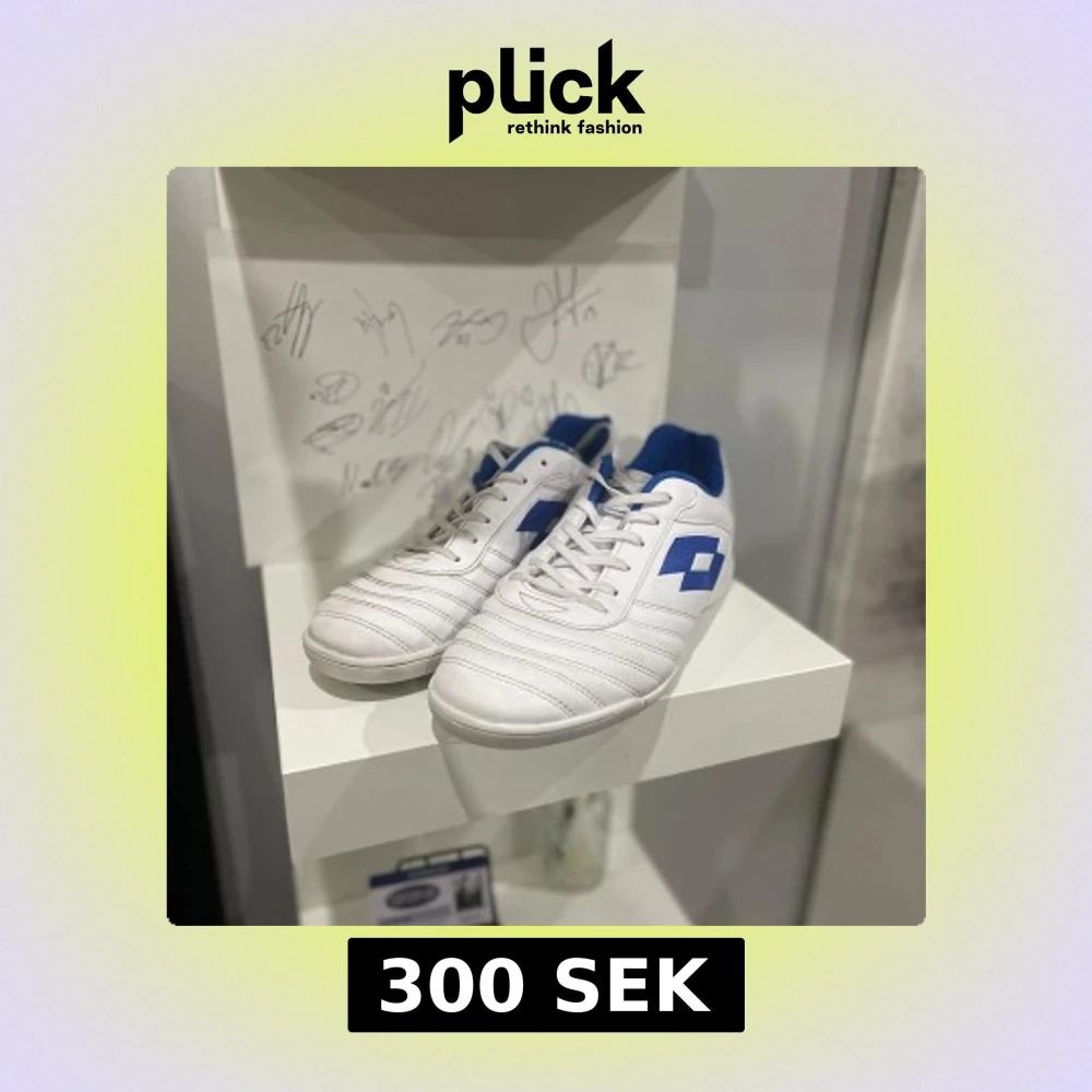 Snygga vita fotbollsskor från Lotto med blå detaljer och snörning. Perfekta för fotbollsplanen med en stilren design och bekväm passform.