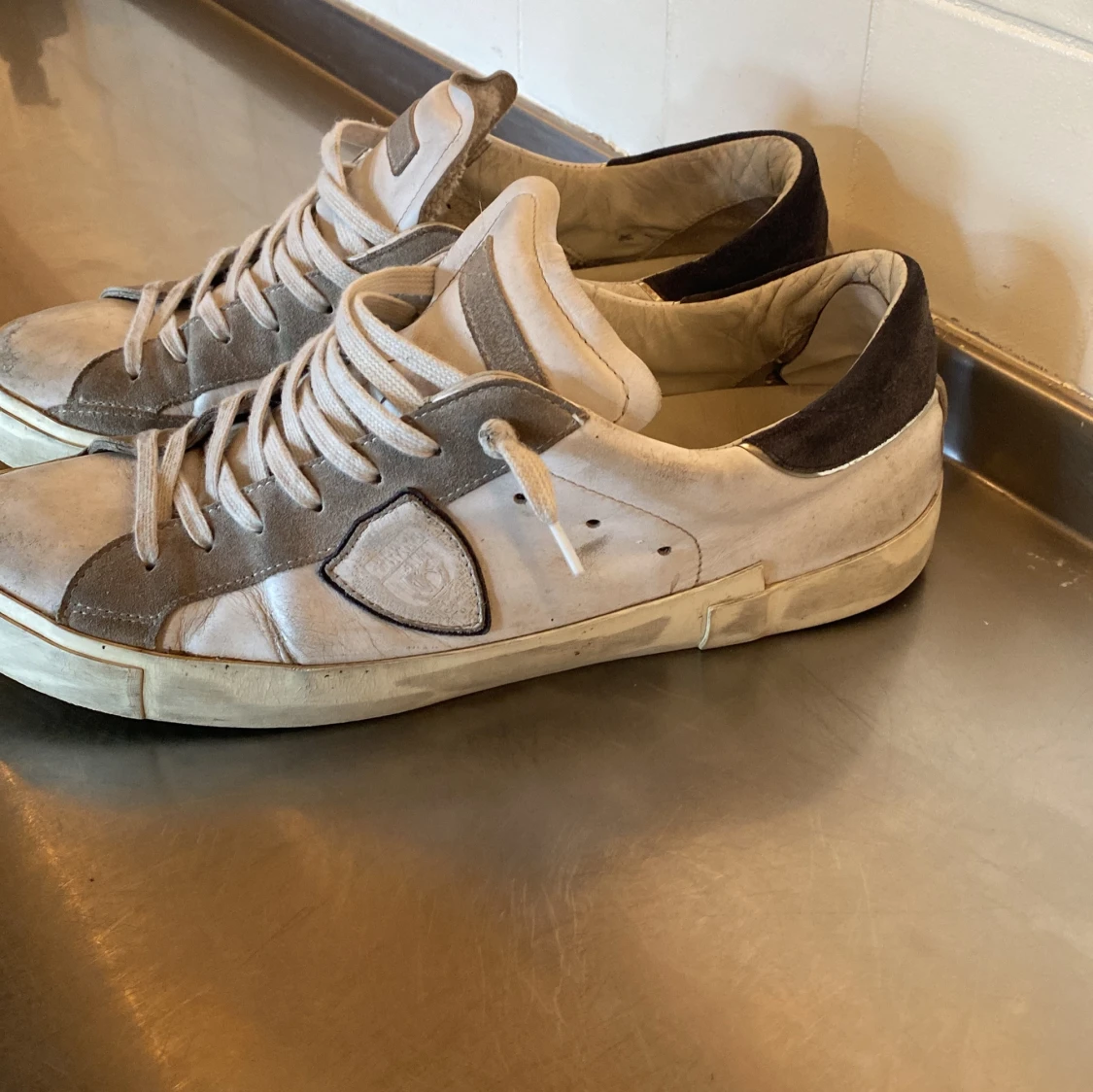 Snygga sneakers från Philippe Model i vitt och grått med klassisk låg profil. Skorna har snörning, rund tå och detaljer i mocka och skinn. Märkets logga syns på sidan. Perfekta för en avslappnad och trendig look.