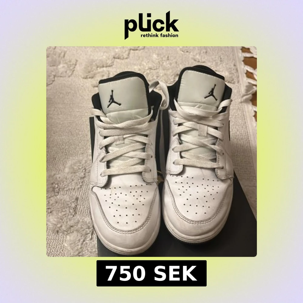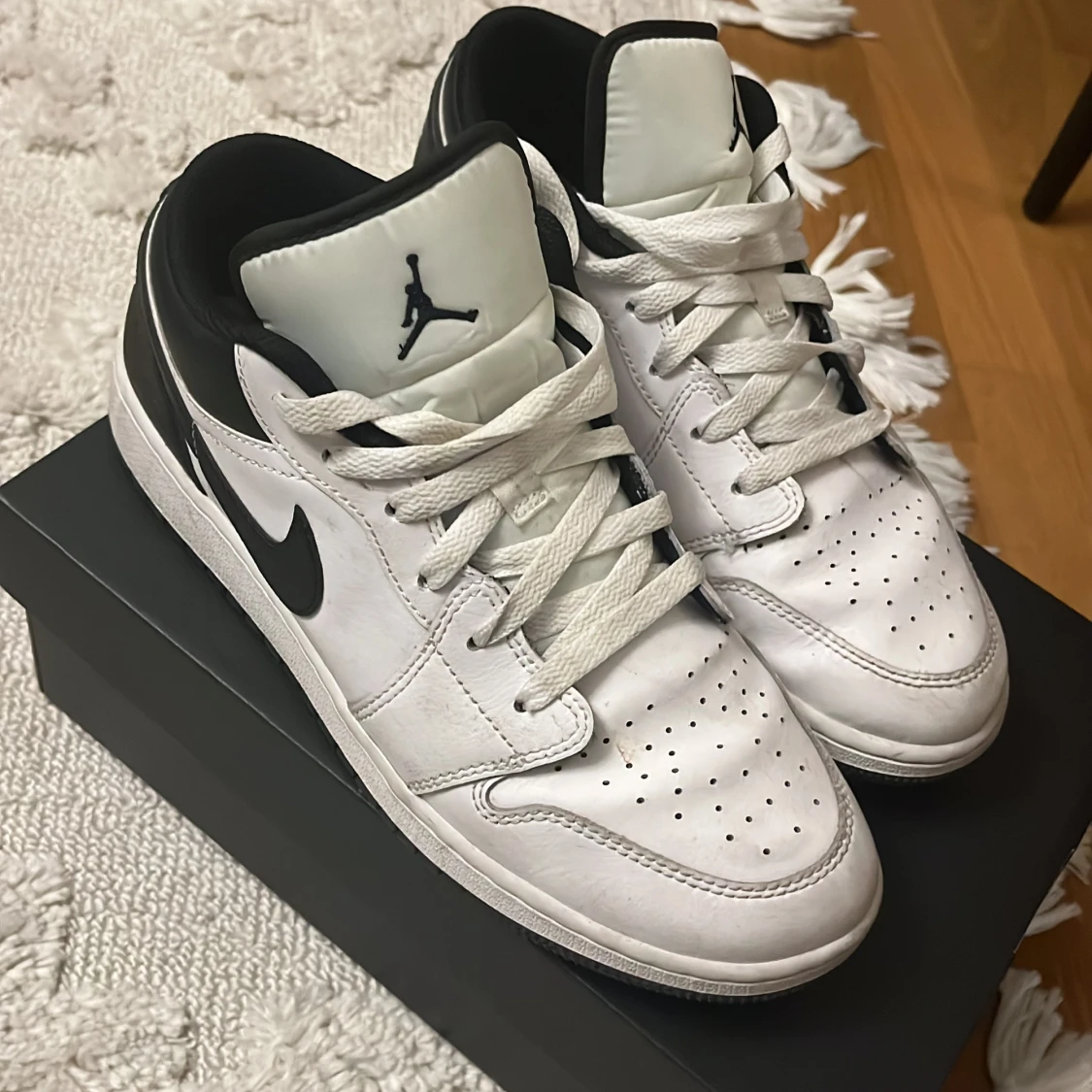 Säljer ett par klassiska vita och svarta Nike Air Jordans med snörning. Skorna har en stilren design med perforerade detaljer på tån och den ikoniska Jumpman-loggan på plösen.