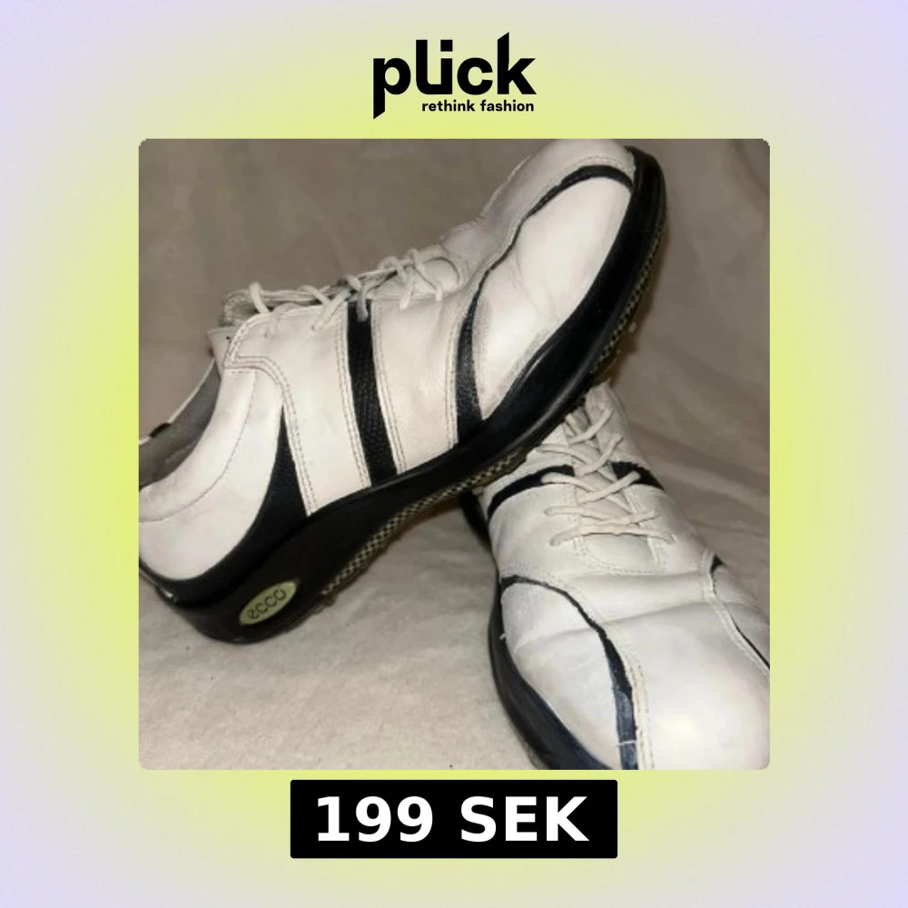 Snygga sneakers från Ecco i vitt skinn med svarta detaljer och snörning. Skorna har en sportig look med rund tå och platt sula, perfekta för en avslappnad stil. Klassisk design med kontrasterande svarta ränder på sidorna och svart sula. Perfekt för golfrundan! Storlek 37