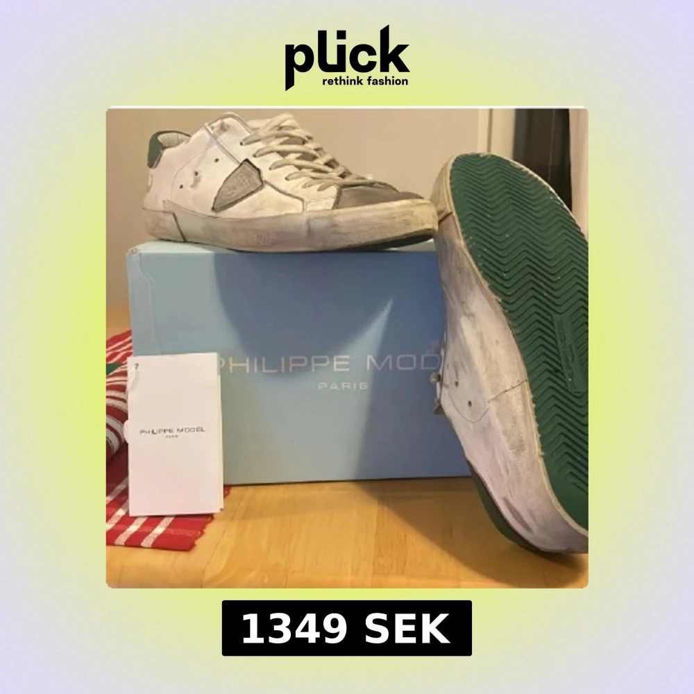 Säljer nu mer mina Snygga vita sneakers från Philippe Model som jag har använd en sommar med gröna detaljer på hälen och gröna sulor. Skorna har snörning, rund tå och är tillverkade i skinn. Perfekta för dig som vill ha feta och snygga skor| bara att skriva vid minsa fundering eller prisförslag💭| skorna är också väldigt lätt tvättade, har tävättat dom nån gång och får dom som nya😊👍🏻