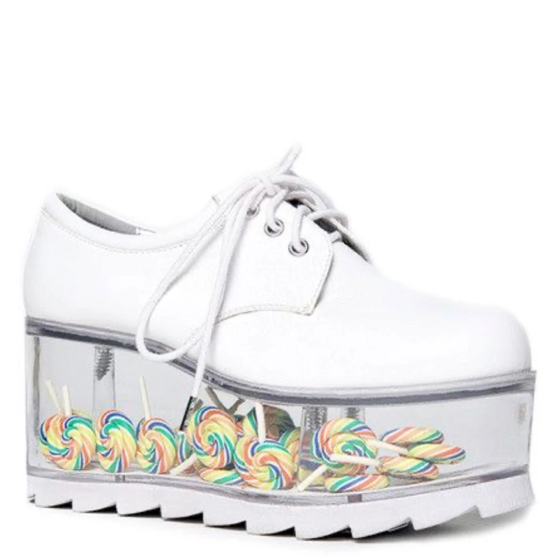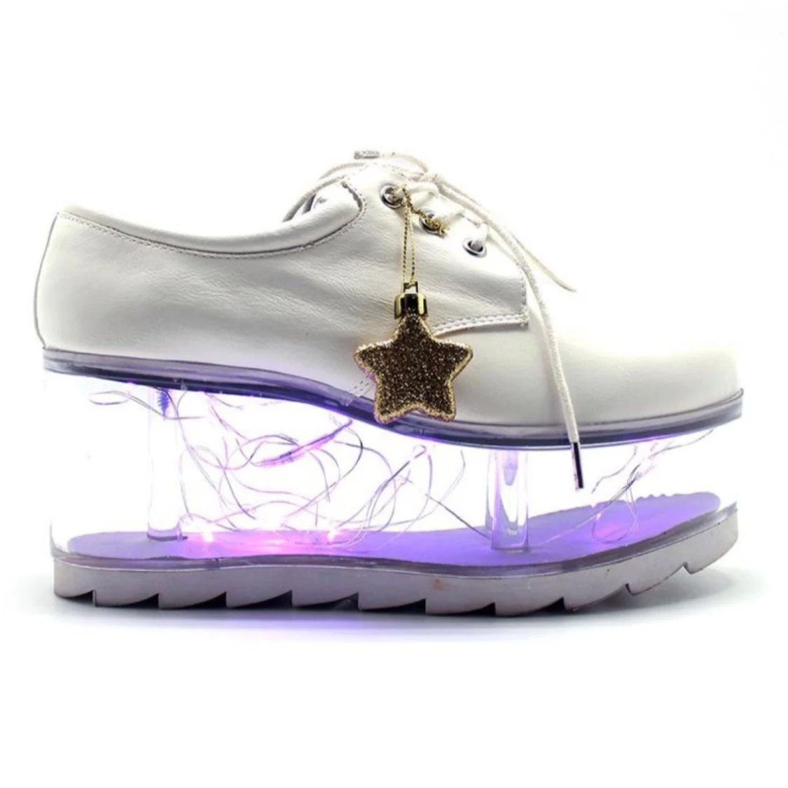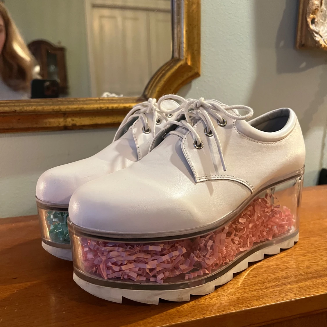 Unika vita platåskor med transparent sula som man kan fylla med olika saker som konfetti, ljusslingor och godis. Endast kreativiteten sätter gränserna. Märke Qloud köpta från Dolls kill, nypris var över 100$ plus frakt. Fick de i födelsedagspresent för många år sedan men är inte längre min stil. Knappt använda. De två första bilderna är mina
