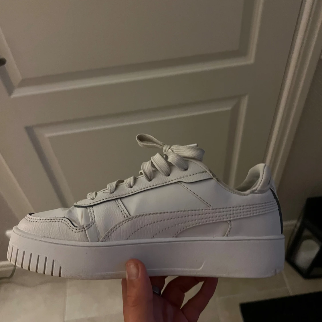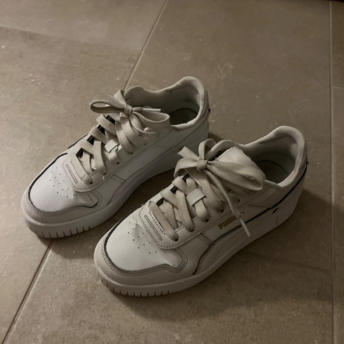Tja! Säljer ett par vita puma skor åt tjejen då de inte riktigt kommit till användning, knappt använda men finns väck i lädret, storlek 37 men sitter som 36 (säger hon), hör av er vid frågor! Mvh Ludde