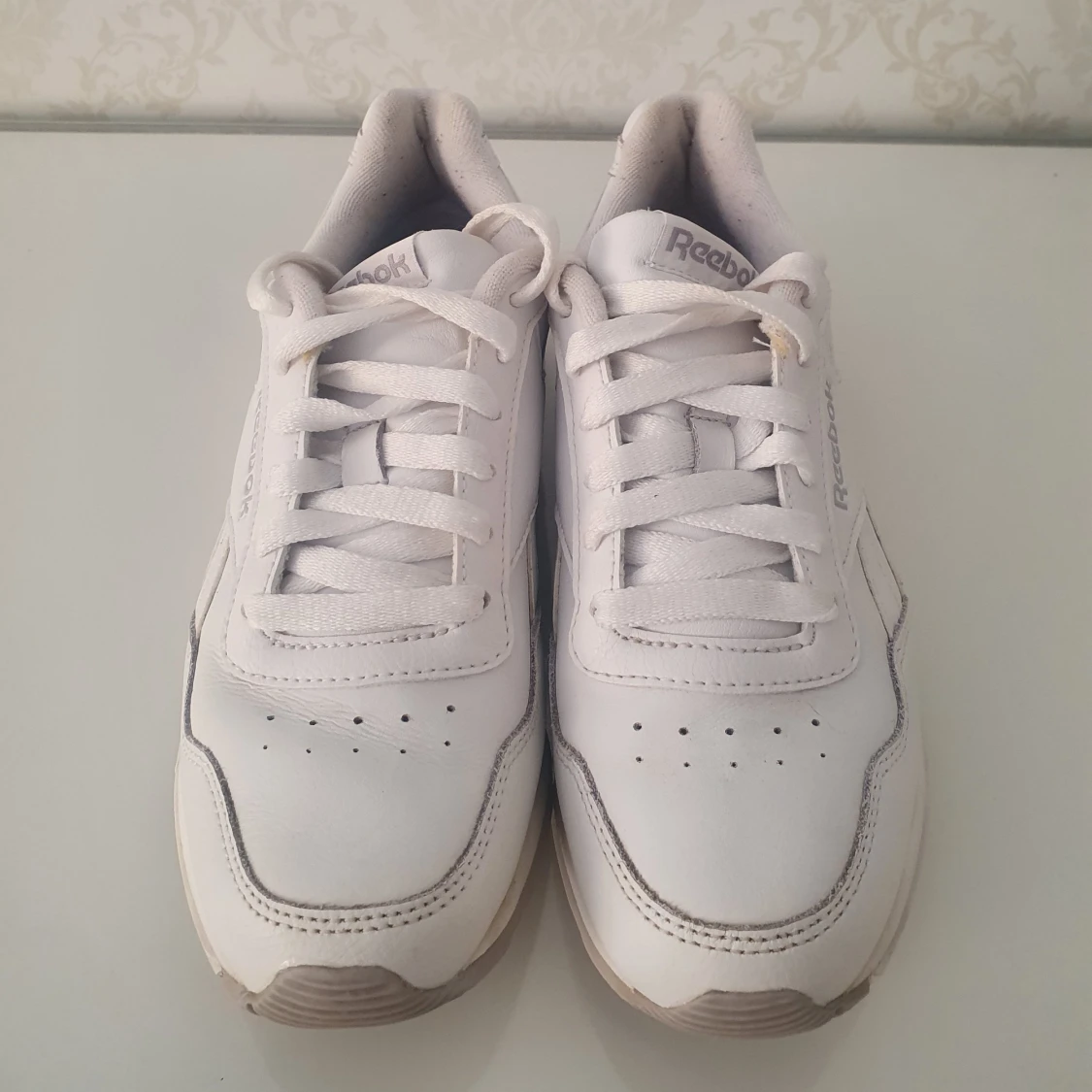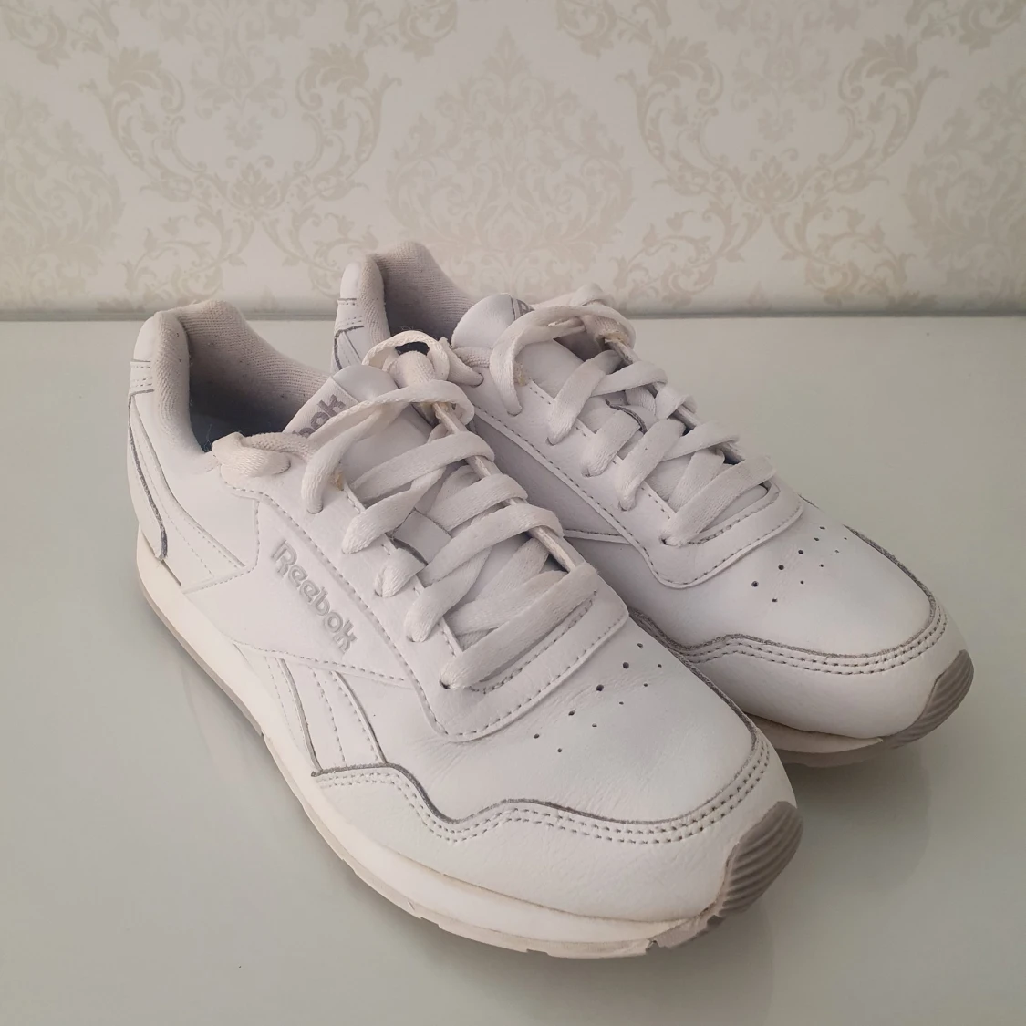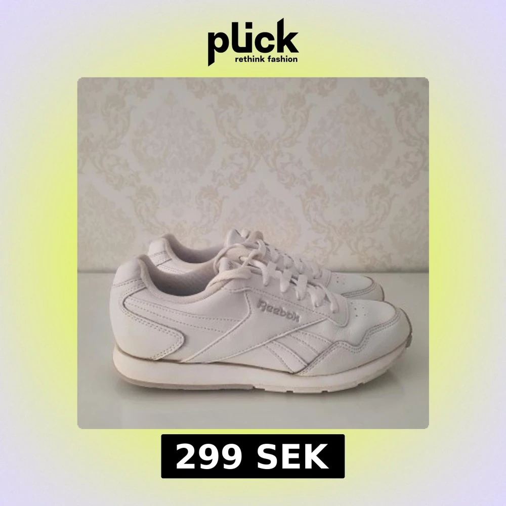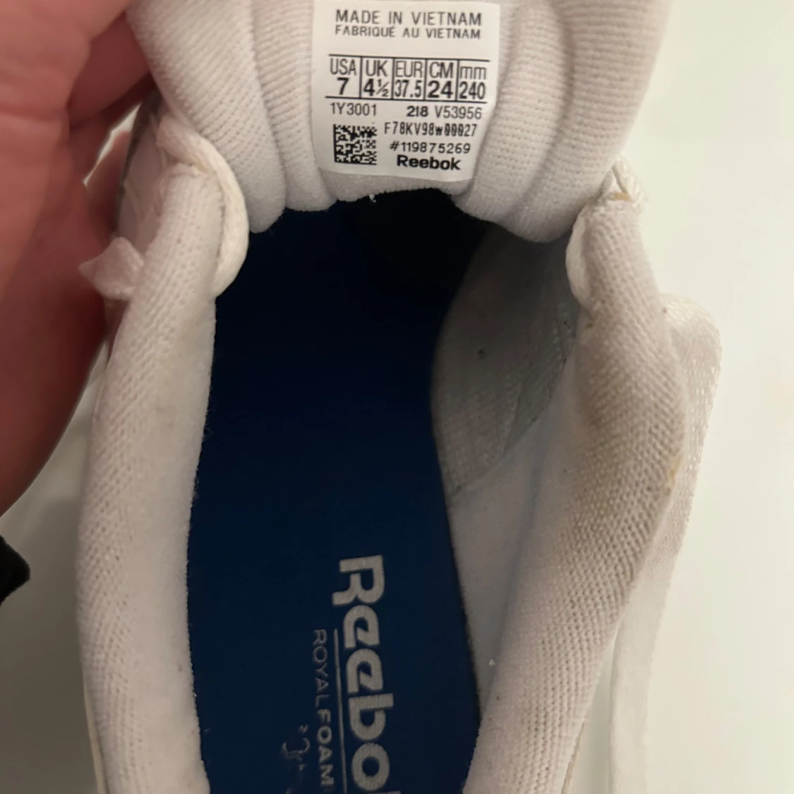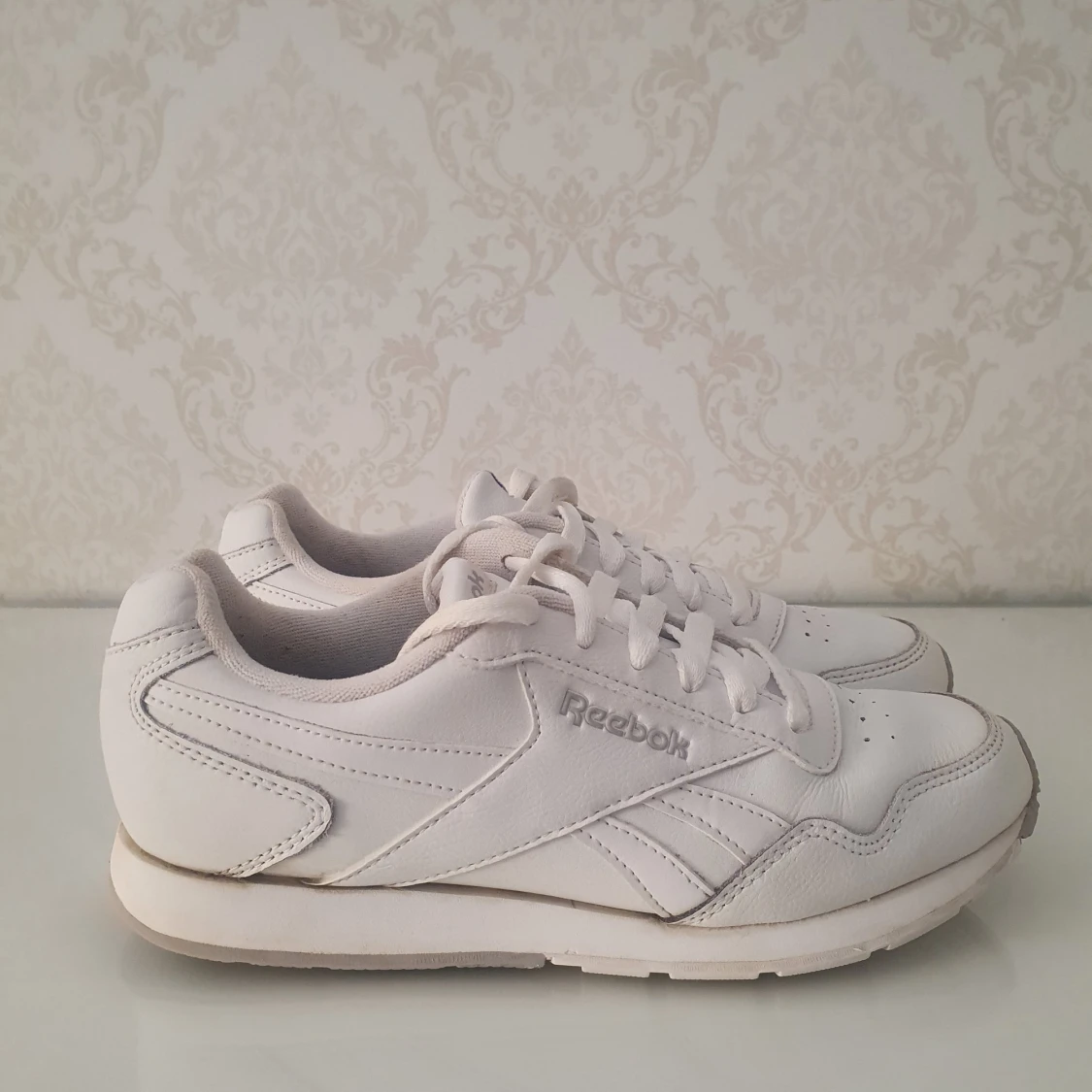 Vita Reebok sneakers i storlek 37,5. Modellen har rund tå, snörning och platt sula. Skorna är i det stora hela i fint skick.