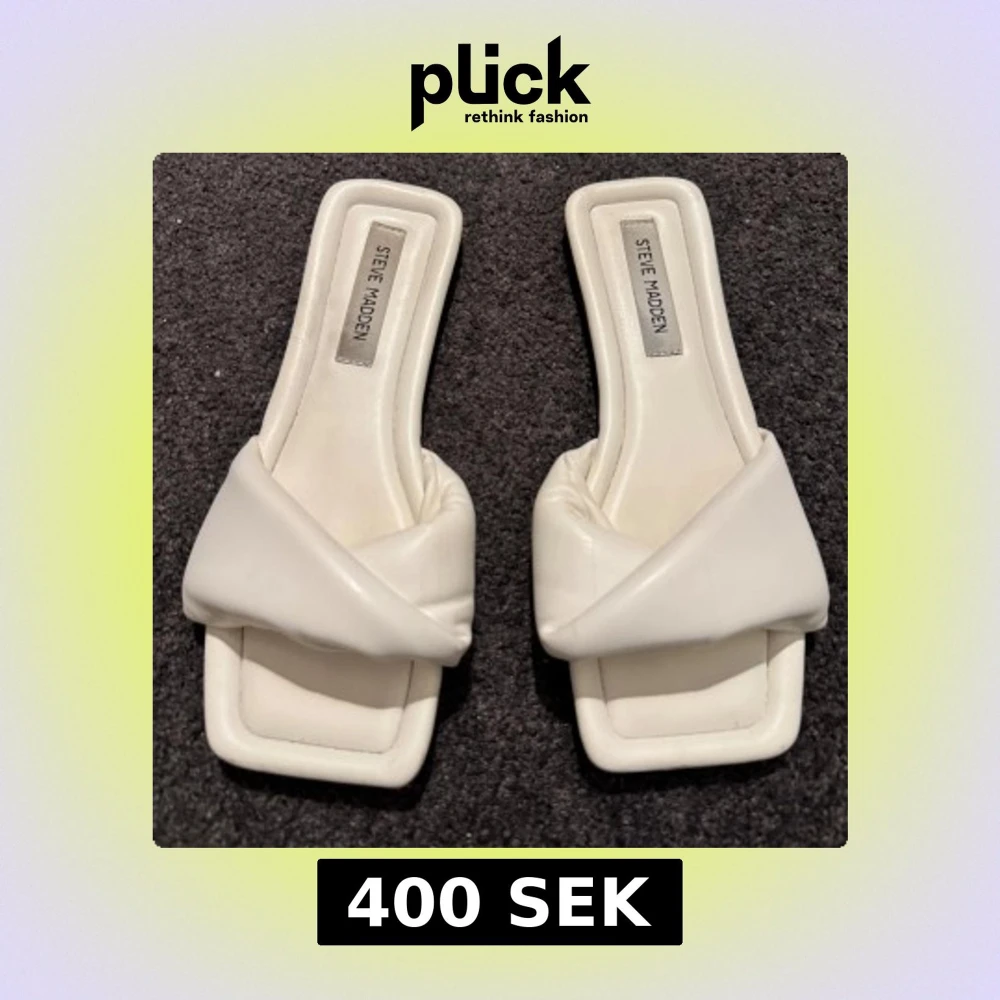 Snygga vita sandaler från Steve Madden med en elegant knutdetalj på ovansidan. De har en fyrkantig tå och har en jätte skön sula, materialet är otroligt! Endast använd vid 1 tillfälle så de är precis som nya😍🤌🏼