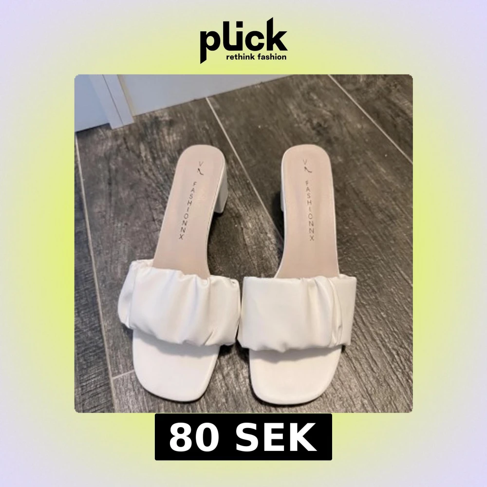 Säljer ett par vita sandaler med klack. De har en bred, rynkad rem över foten och fyrkantig tå. Skorna har en låg klack, storlek 38. Aldrig använda