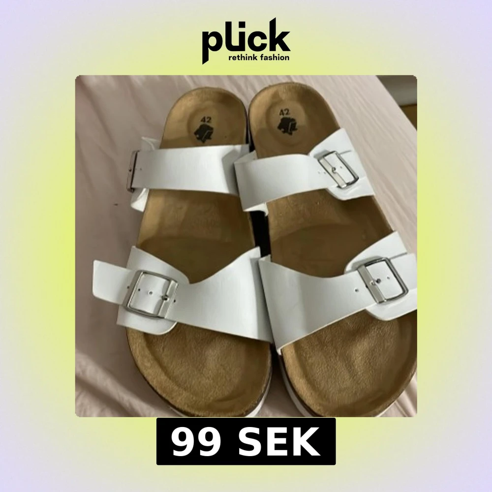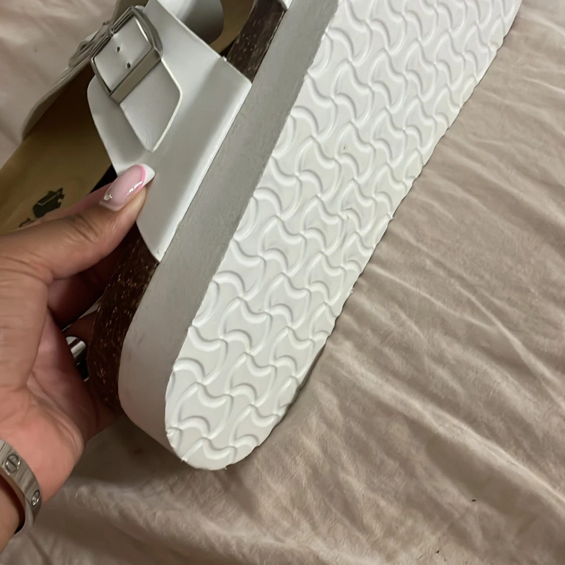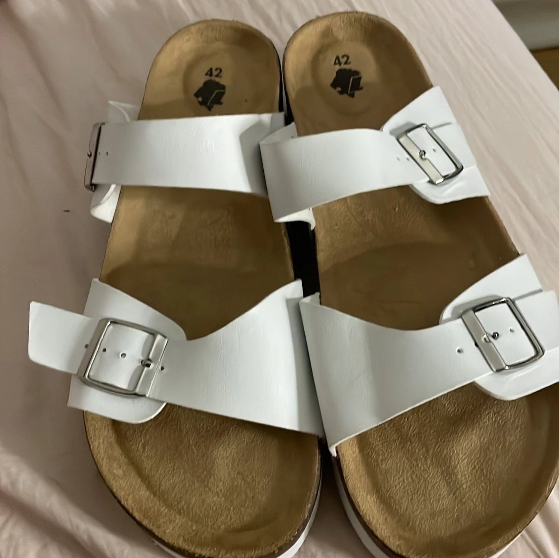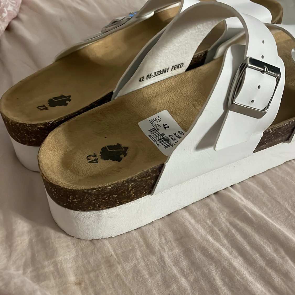 Snygga vita sandaler med breda remmar och silvriga spännen. De har en rejäl plattformsula i vitt och korkdetaljer på sidan. Ovandelen är i syntet och sulan har ett vågigt mönster undertill. Perfekta för en trendig sommarlook.