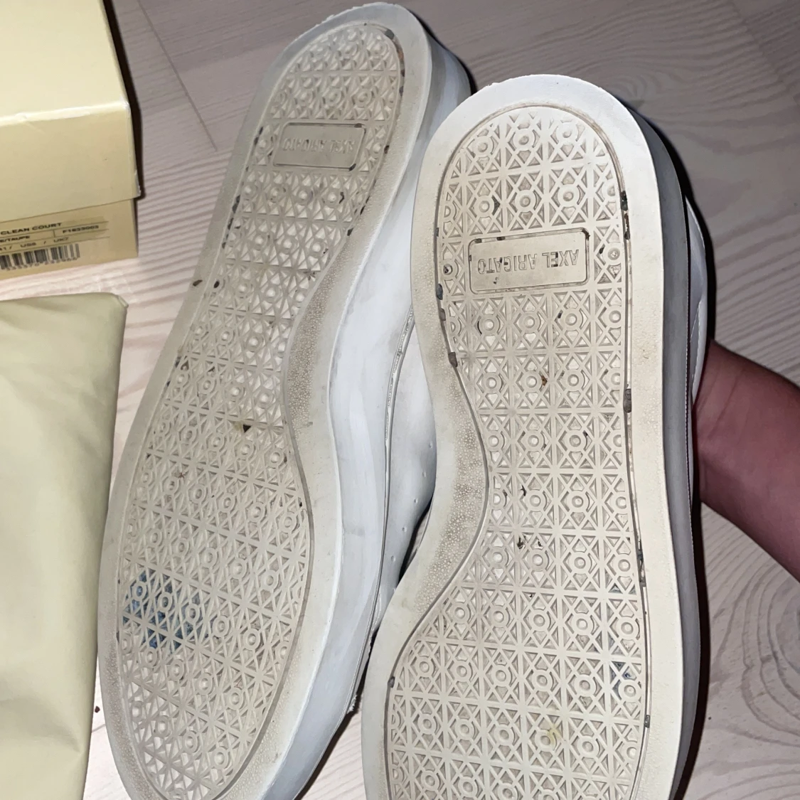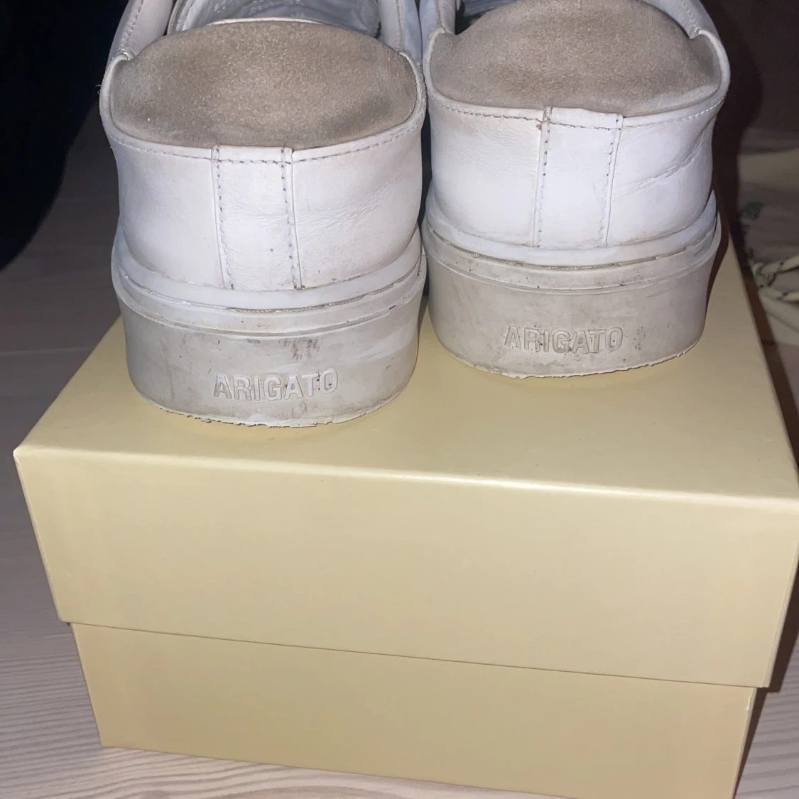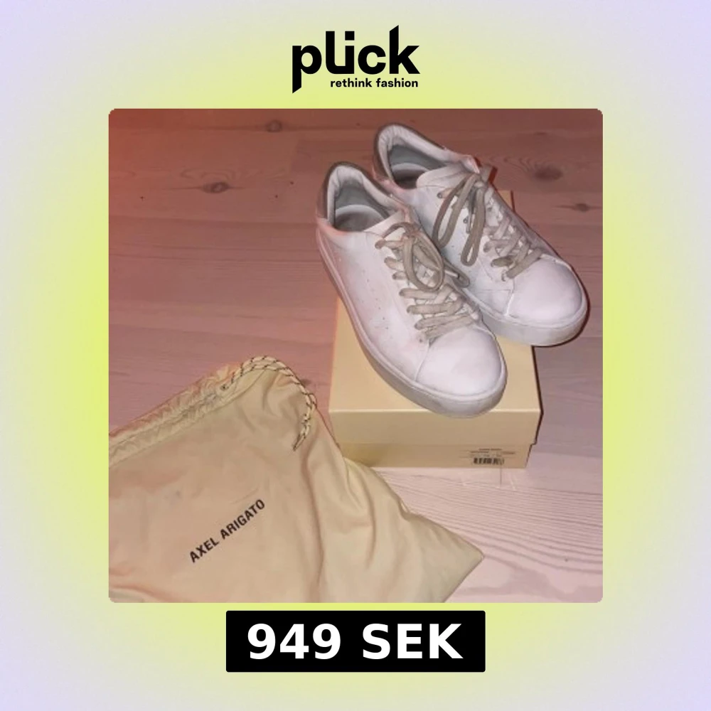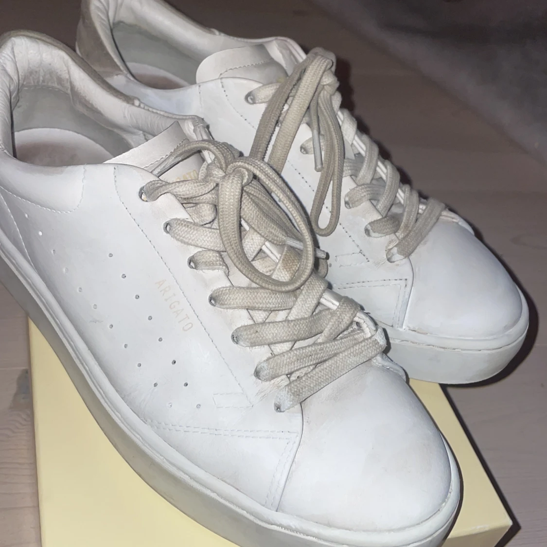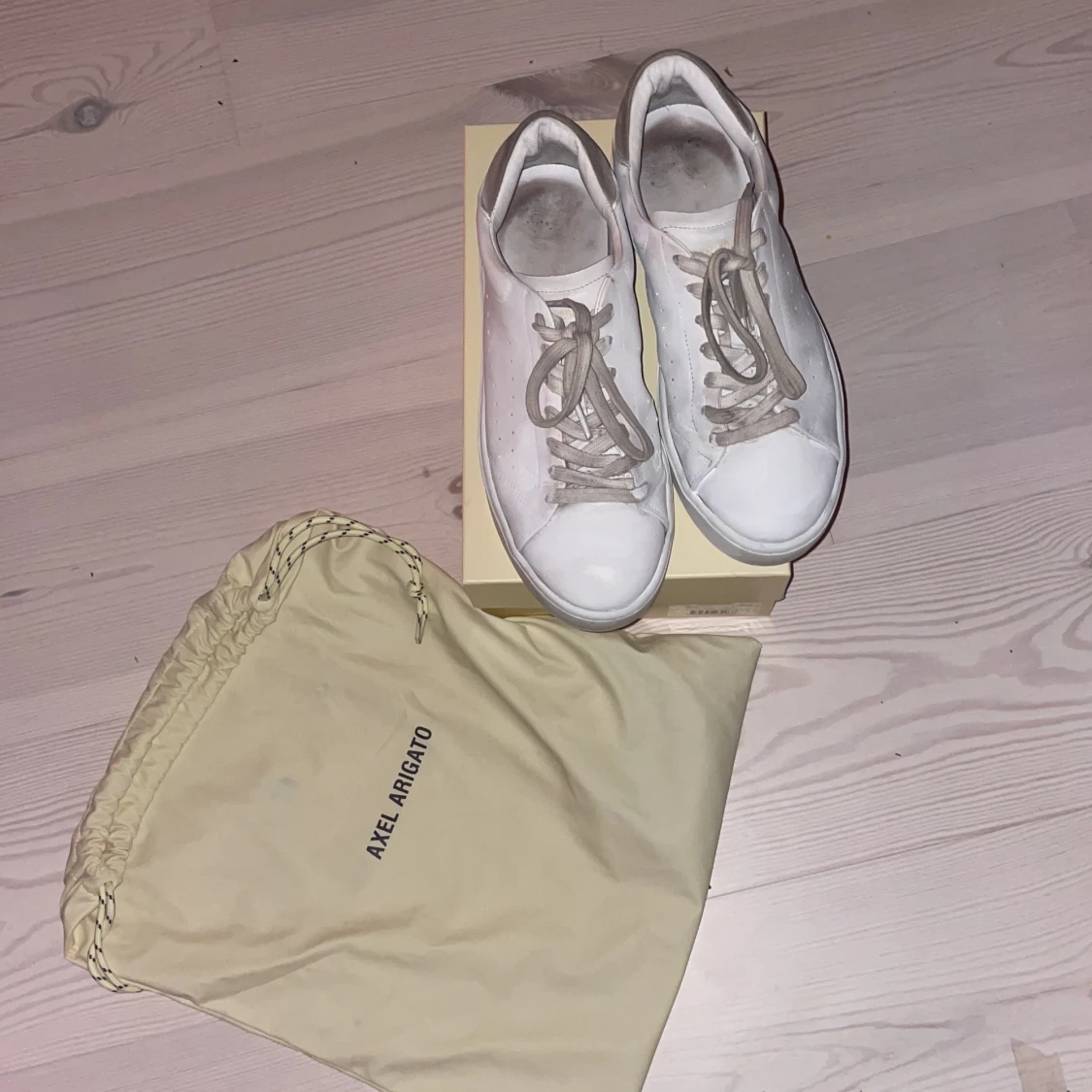 Säljer ett par stilrena vita sneakers från Axel Arigato med klassisk rund tå och platt sula. Skorna har diskreta perforeringar på sidorna, snörning och logga på både sidan och hälen. Medföljer original dustbag och låda. Perfekta för en clean och modern look.