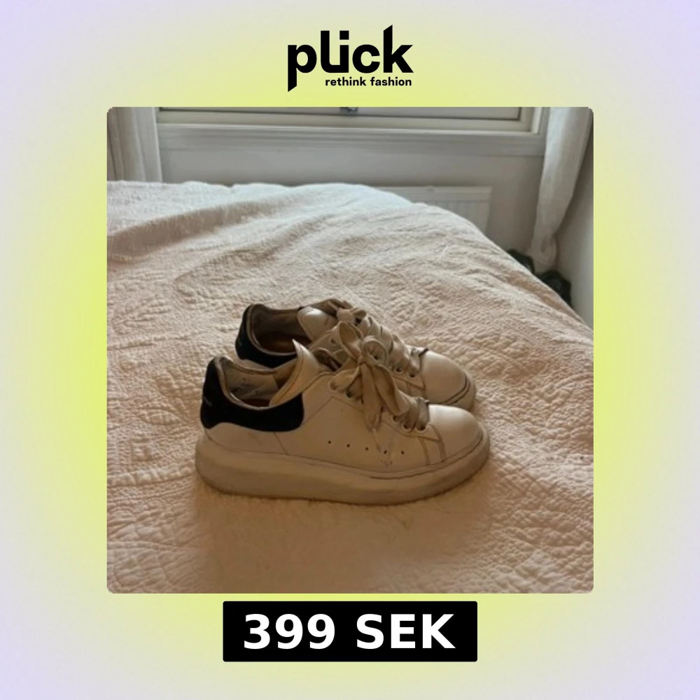 Säljer ett par klassiska vita sneakers från Alexander McQueen med svart hälparti och tjock vit sula. Skorna har snörning och en stilren design som passar till många outfits. Jätteslitna. Har fler bilder om det behövs