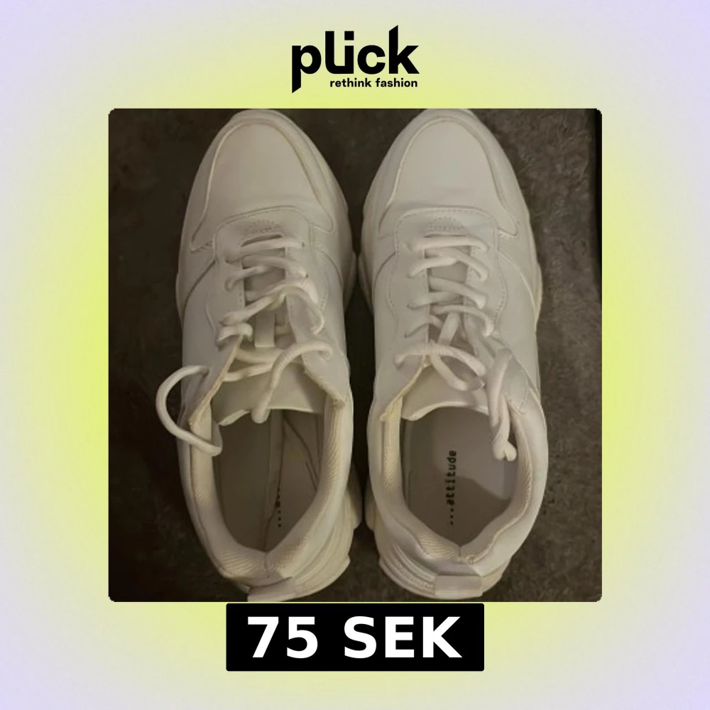 Snygga vita sneakers från Attitude med klassisk snörning. Perfekta för en stilren look. Skorna har en rund tå och är tillverkade i syntetmaterial. Använda en gång. Små i storleken.