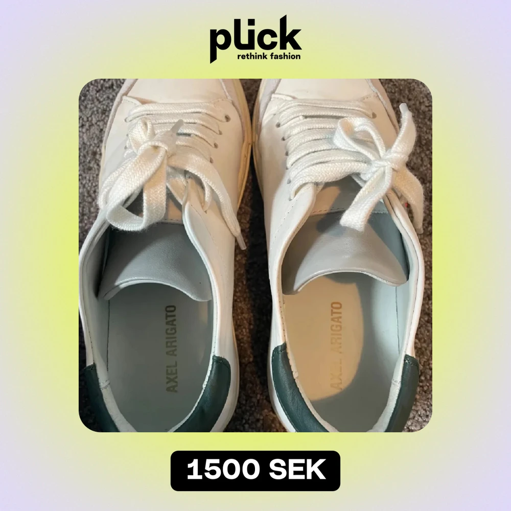 Säljer ett par snygga vita sneakers från Axel Arigato med gröna detaljer och en cool broderad fågel på sidan. Skorna har snörning och är i mycket bra skick. Perfekta för vardagen, priset går att diskutera