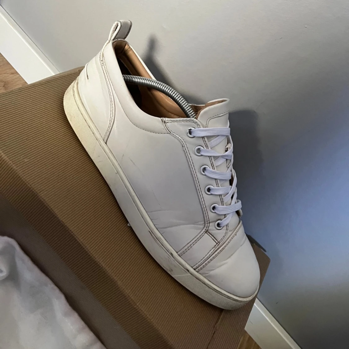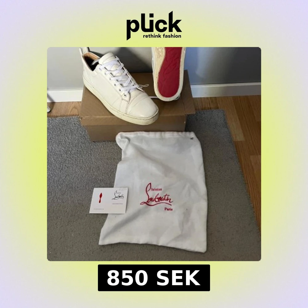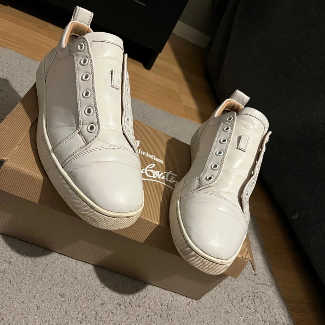 Säljer ett par vita sneakers från Christian Louboutin med klassisk röd sula. Skorna har rund tå, snörning och är tillverkade i skinn. Perfekta för dig som gillar stilrena och exklusiva sneakers. Tar emot byten eller skicka prisförslag