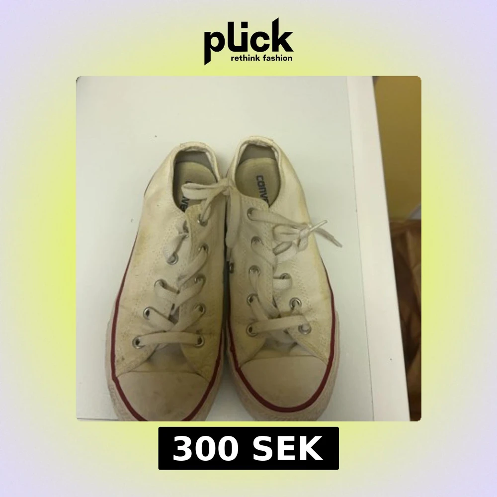 Säljer ett par klassiska vita Converse sneakers med snörning och röd rand längs sulan. Perfekta för en avslappnad stil. Obs, behöver rengöras.