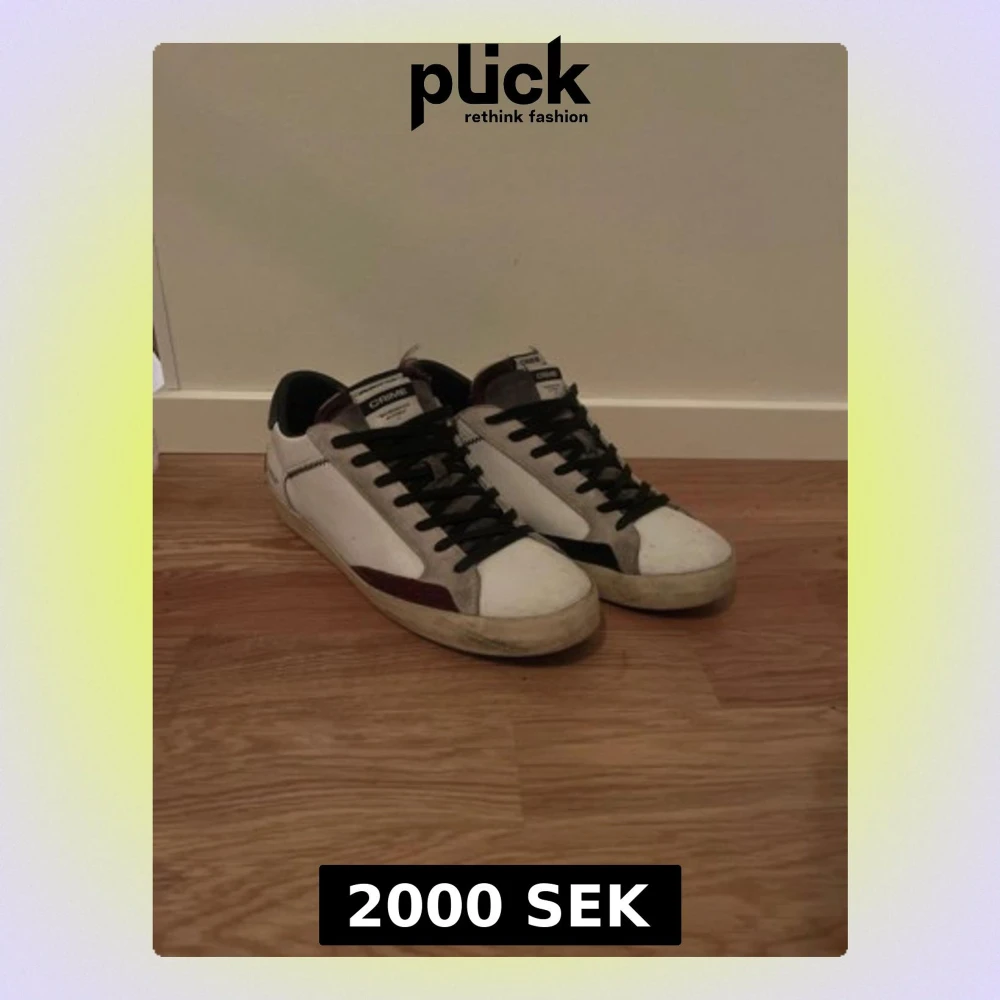 Snygga vita sneakers från Crime London med svarta snören och detaljer i grått och vinrött. Skorna har rund tå, platt sula och är tillverkade i skinn med mockadetaljer. Märket syns tydligt på plösen och hälen. Perfekta för dig som gillar streetstyle.