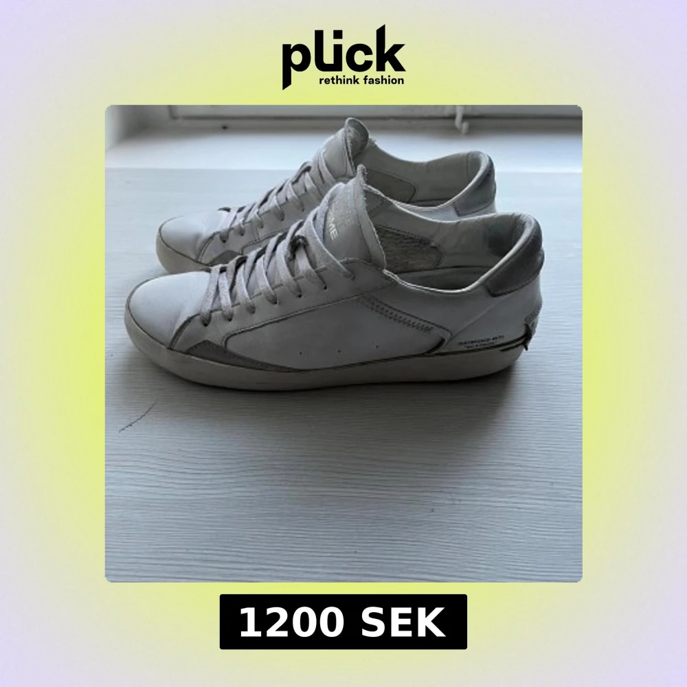 Säljer ett par stilrena vita sneakers från Crime London med rund tå och platt sula. Skorna har snörning, detaljer i ljusgrå mocka vid hälen och sidorna, samt en gummisula med Crime London-logga undertill.