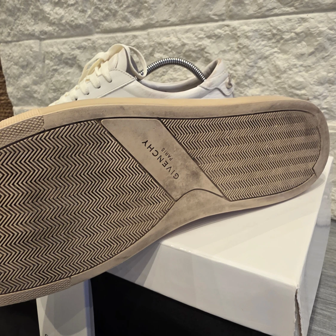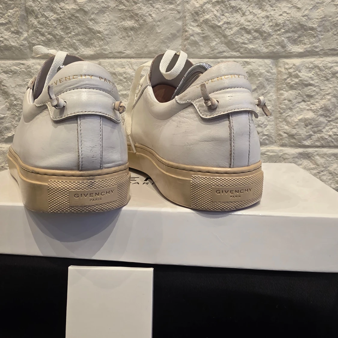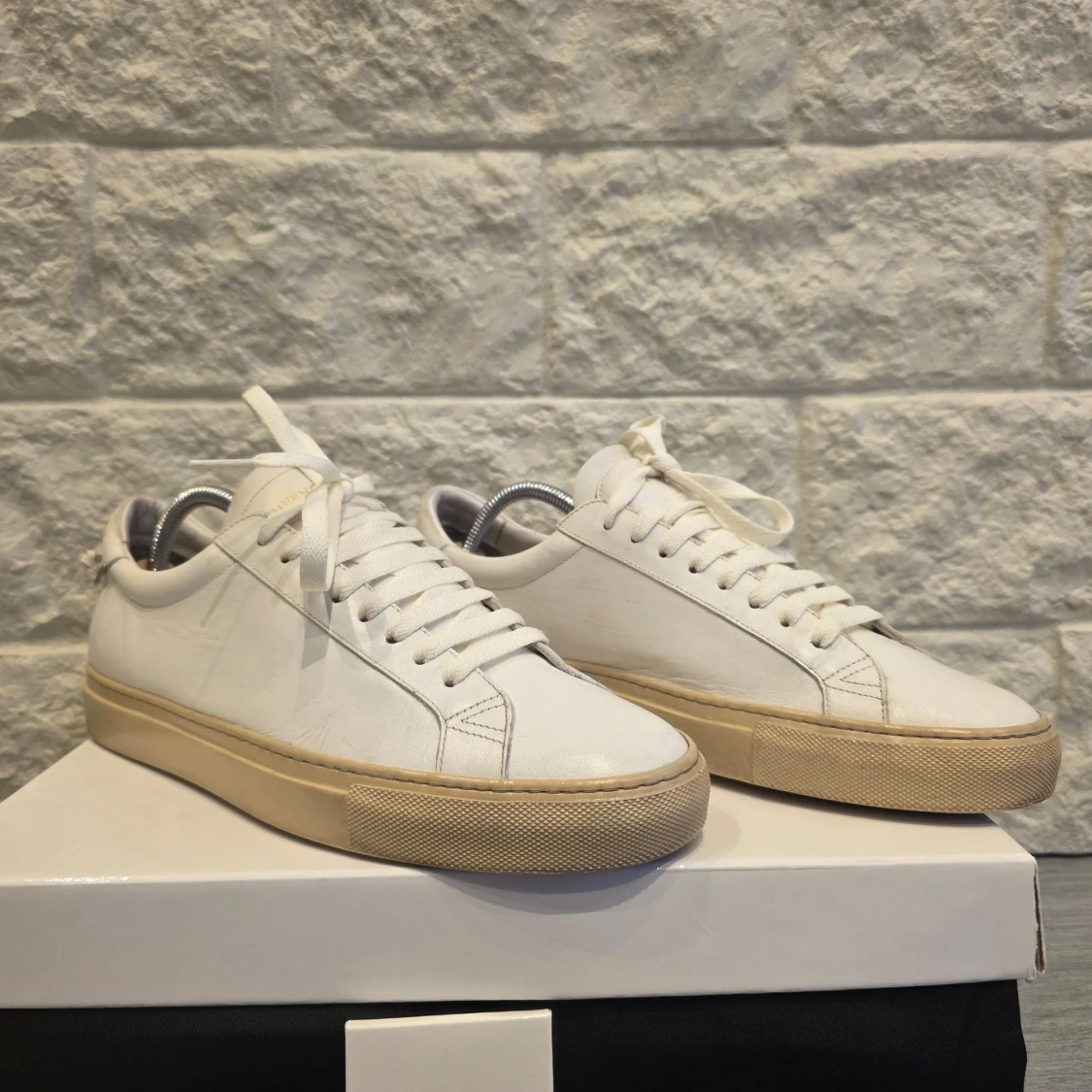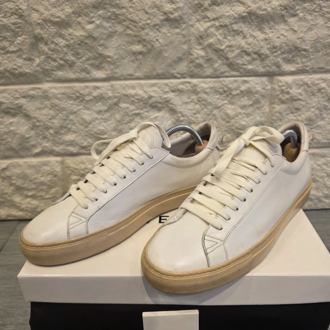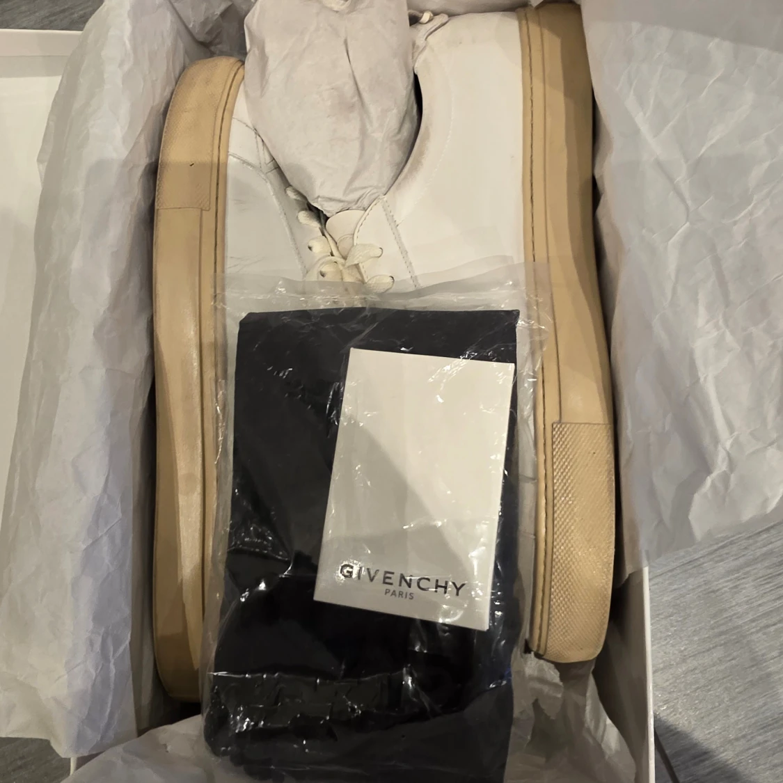 Snygga vita sneakers från Givenchy med en stilren design. Skorna har en vit ovandel i skinn och en beige sula. Givenchy-loggan syns på hälen och sulan. Perfekta för en minimalistisk look.