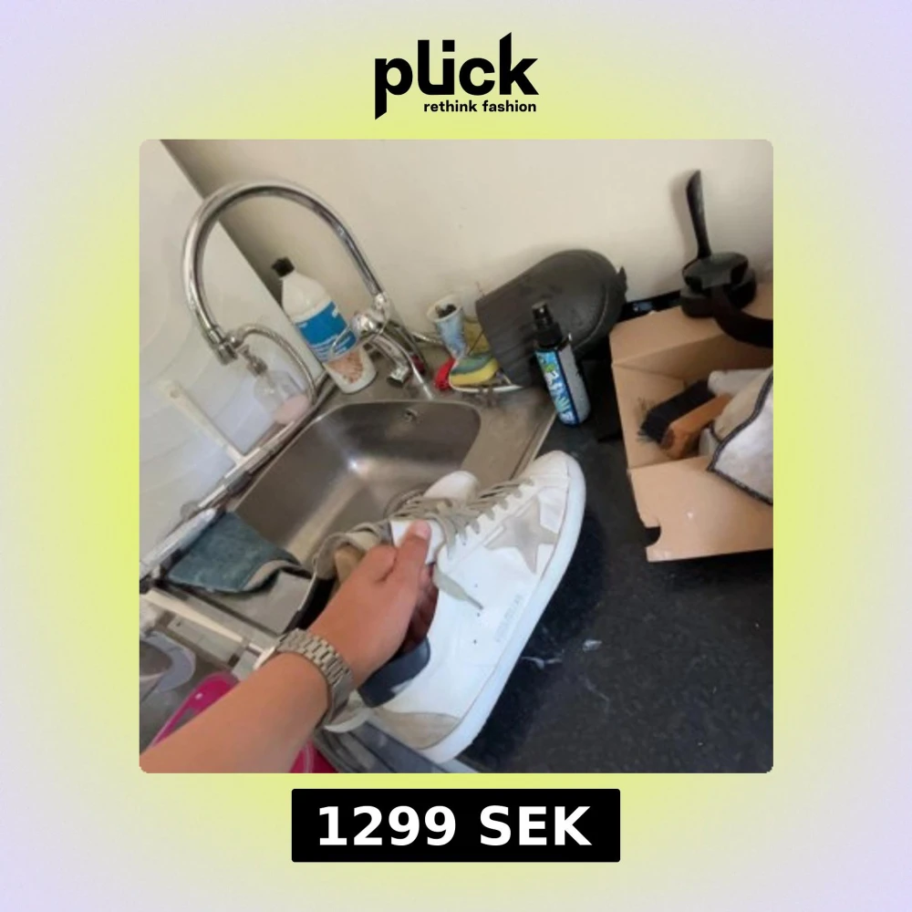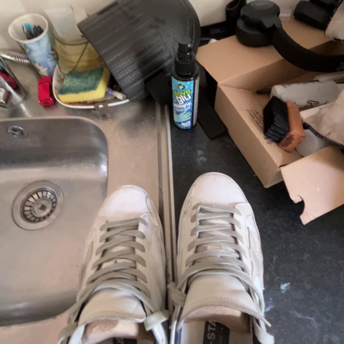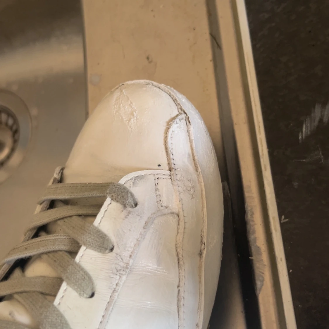 Säljer ett par klassiska vita Golden Goose sneakers med grå stjärndetalj på sidan och grå snörning. Skorna har en rund tå och är tillverkade i skinn med slitna detaljer för en cool, vintage look. Perfekta för dig som gillar streetstyle och vill ha något unikt. Dom är lite sönder för ramla med scooter som man ser men har täckt med whiting cream allt og får man med
