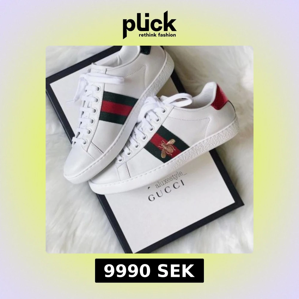 Säljer ett par vita sneakers från Gucci med gröna och röda ränder på sidan samt en broderad guldfärgad bi. Skorna har vit snörning och detaljer i rött och grönt på hälen. Klassisk och stilren modell.