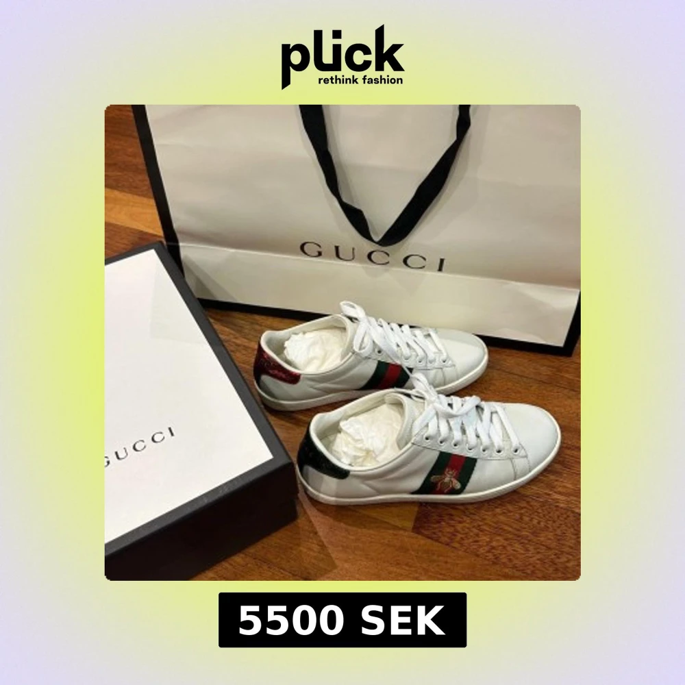 Snygga vita sneakers från Gucci med klassiska gröna och röda ränder samt en broderad insekt på sidan. Skorna har snörning och en stilren design som passar perfekt för en trendig look.