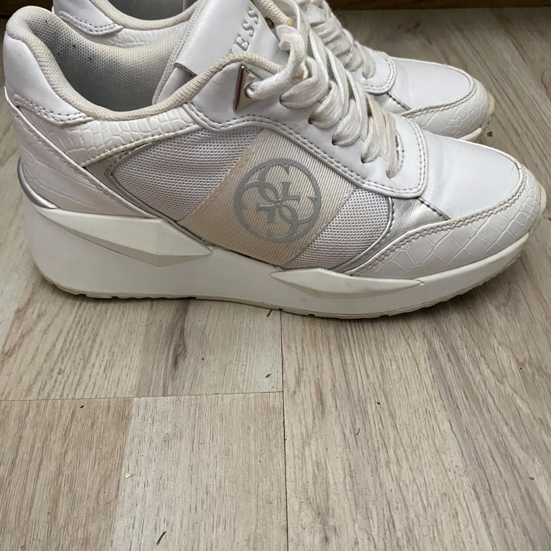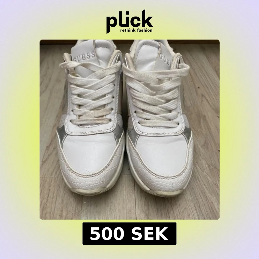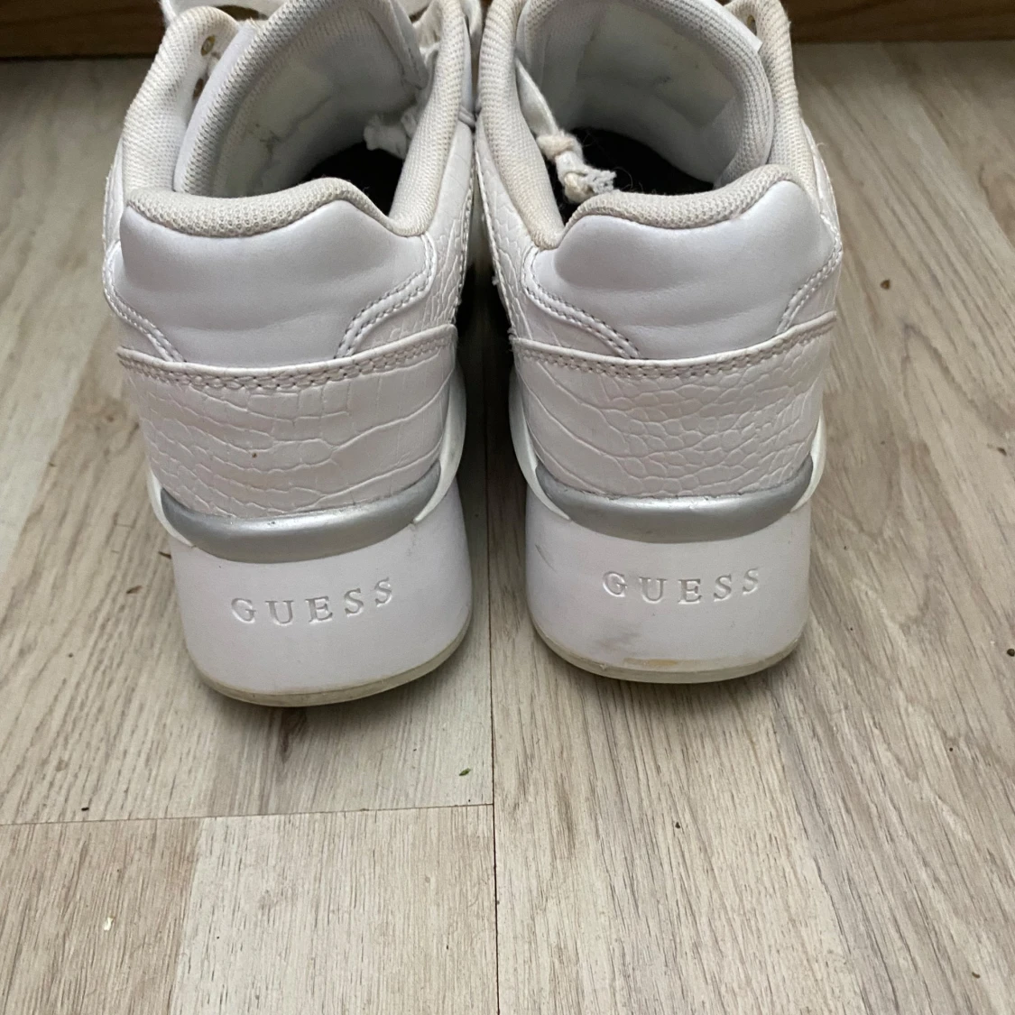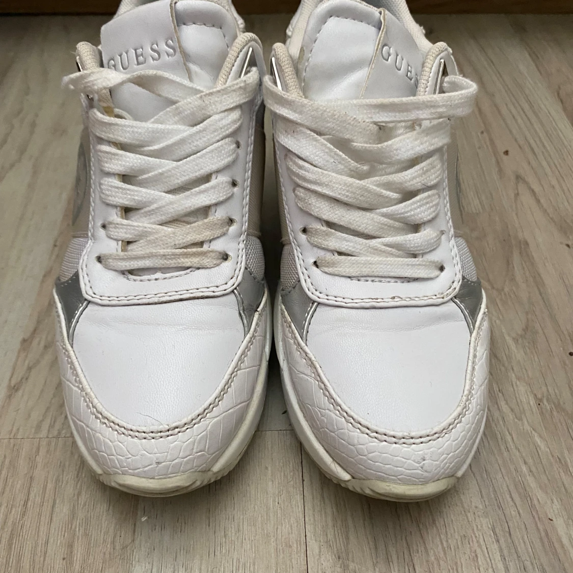 Snygga vita sneakers från Guess med platåsula och silvriga detaljer. Skorna har snörning, croco-mönstrade partier och mesh på sidorna med Guess-logga. Perfekta för dig som vill ha en fräsch och trendig look med extra höjd.