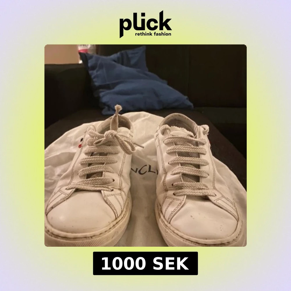 Snygga vita sneakers från Moncler med klassisk snörning och logotypdetalj. Perfekta för en stilren look. Skick 7/10 då bakre delen på höger sko är trasig, dustbag till skora kommer med! 1000kr kommer andvändas som en startgrund för pris, dock kan pris diskuteras privat