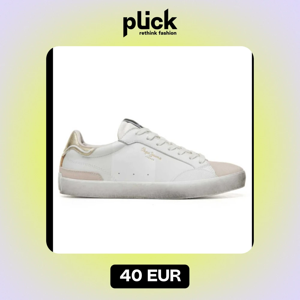 Snygga vita sneakers från Pepe Jeans i skinn med detaljer i beige och guld. De har en klassisk snörning och en bekväm passform. Perfekta för både vardag och festliga tillfällen. Sulan är lätt smutsad för en cool, använd look.