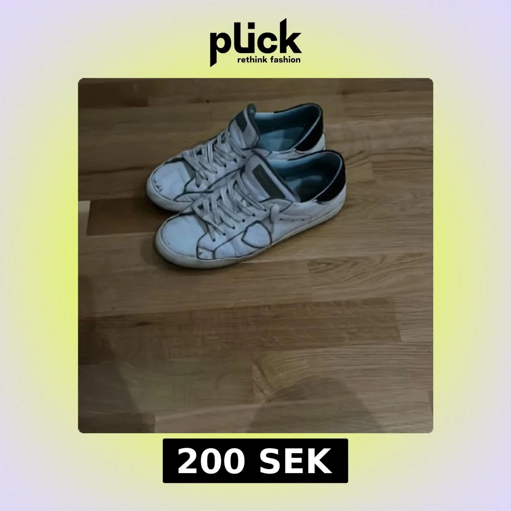 Säljer ett par vita sneakers från Philippe Model med svarta detaljer. Skorna har snörning och en klassisk design. Perfekta för en avslappnad stil.