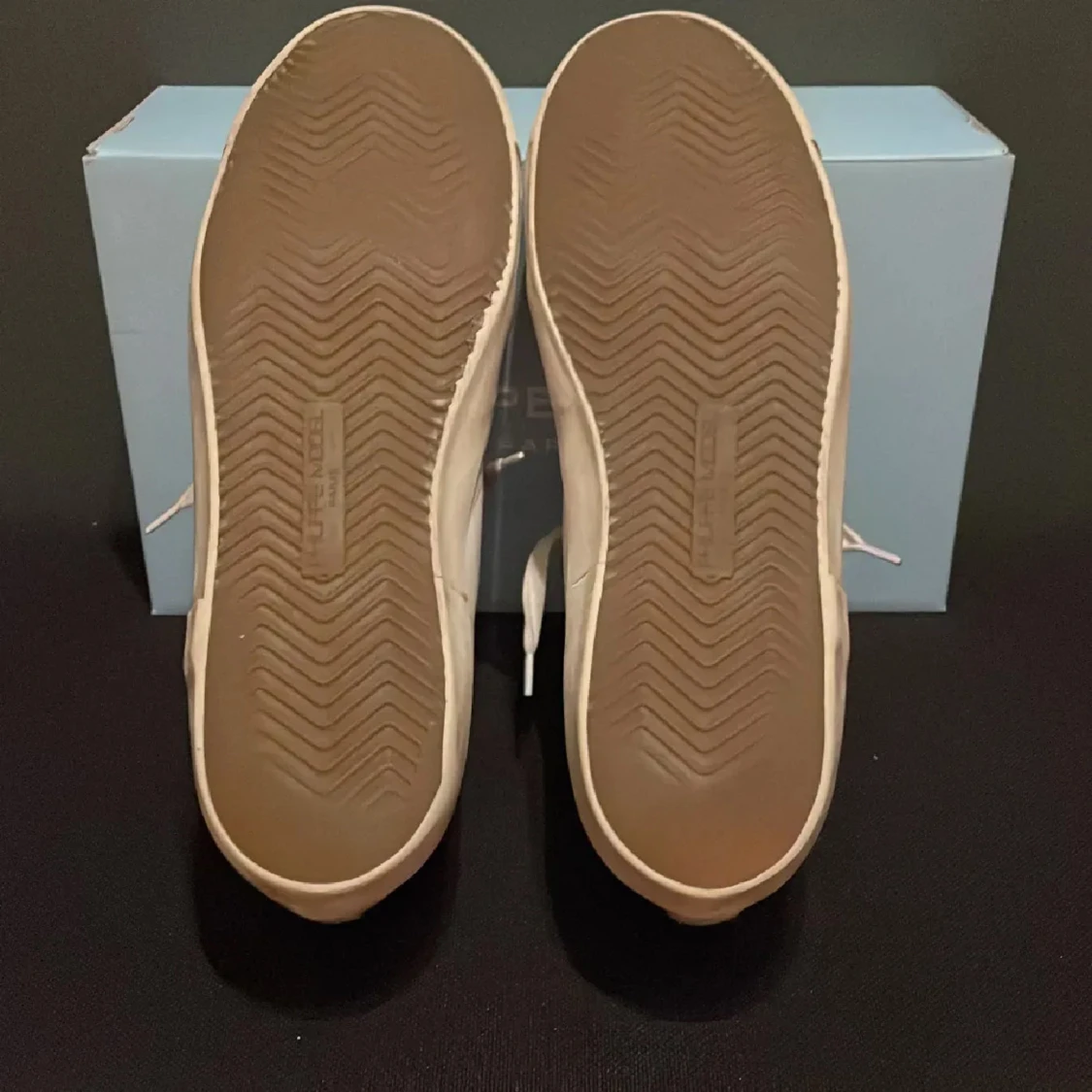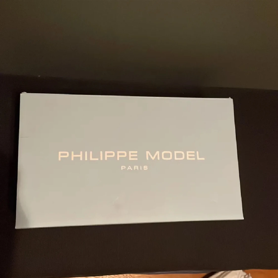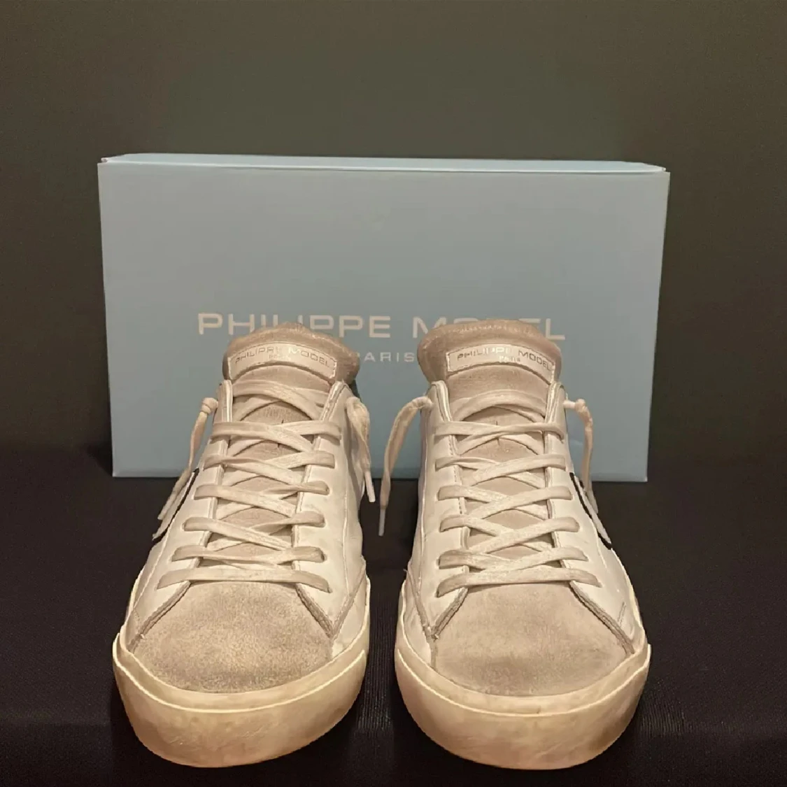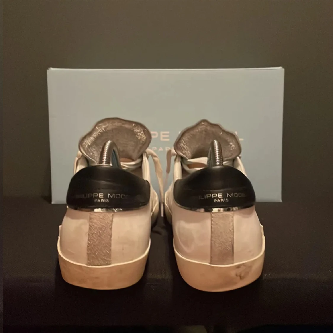 Snygga vita sneakers från Philippe Model med svarta detaljer på hälen. Skorna har en klassisk design med snörning och en diskret logga på sidan. Perfekta för en stilren look.