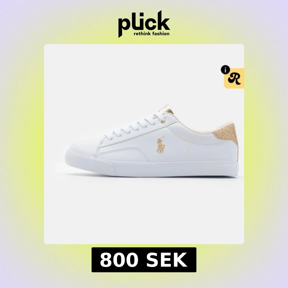 Stilrena vita sneakers med gulddetaljer från Polo Ralph Lauren. Skorna har snörning, rund tå och en glittrig guldpanel vid hälen. Märkets ikoniska logga i guld syns på sidan och plösen. Perfekta för en fräsch och sportig look.