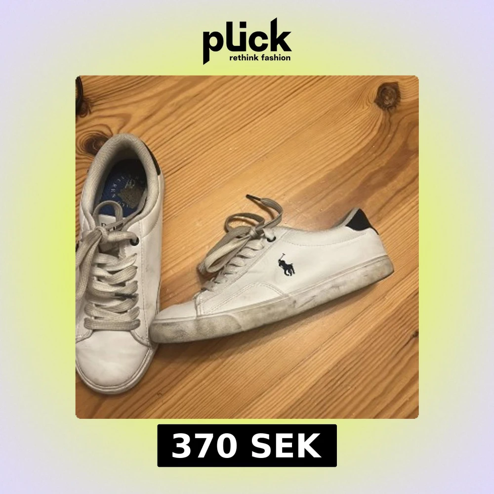 Snygga vita sneakers från Polo Ralph Lauren med klassisk blå logga på sidan. Skorna har rund tå, platt sula och snörning. Perfekta för en clean och stilren look. Ny pris 1200kr