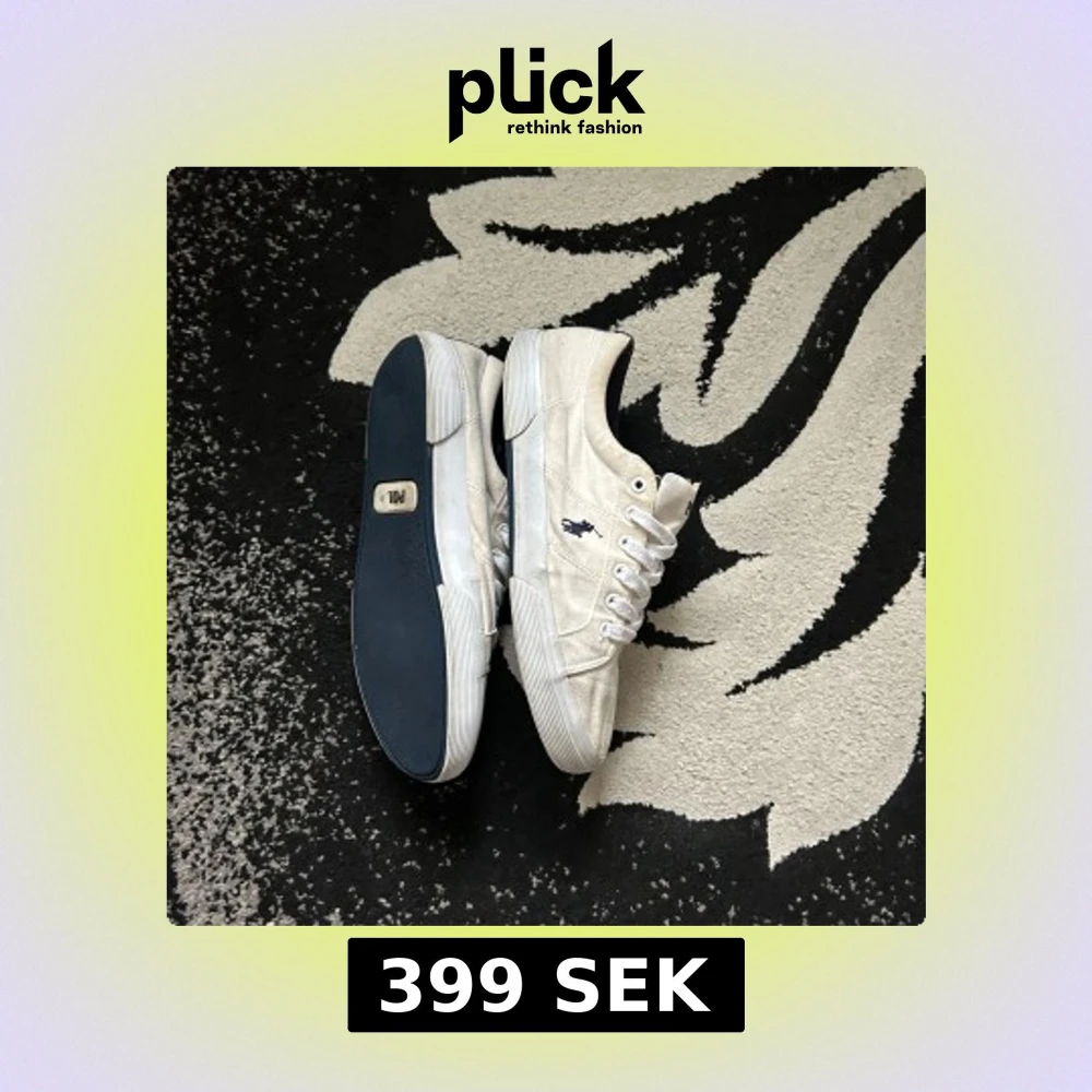 Säljer ett par vita sneakers från Polo Ralph Lauren med klassisk låg profil och snörning. Skorna har en mörkblå sula och den ikoniska Polo-loggan broderad på sidan. Perfekta för en clean och stilren look.
