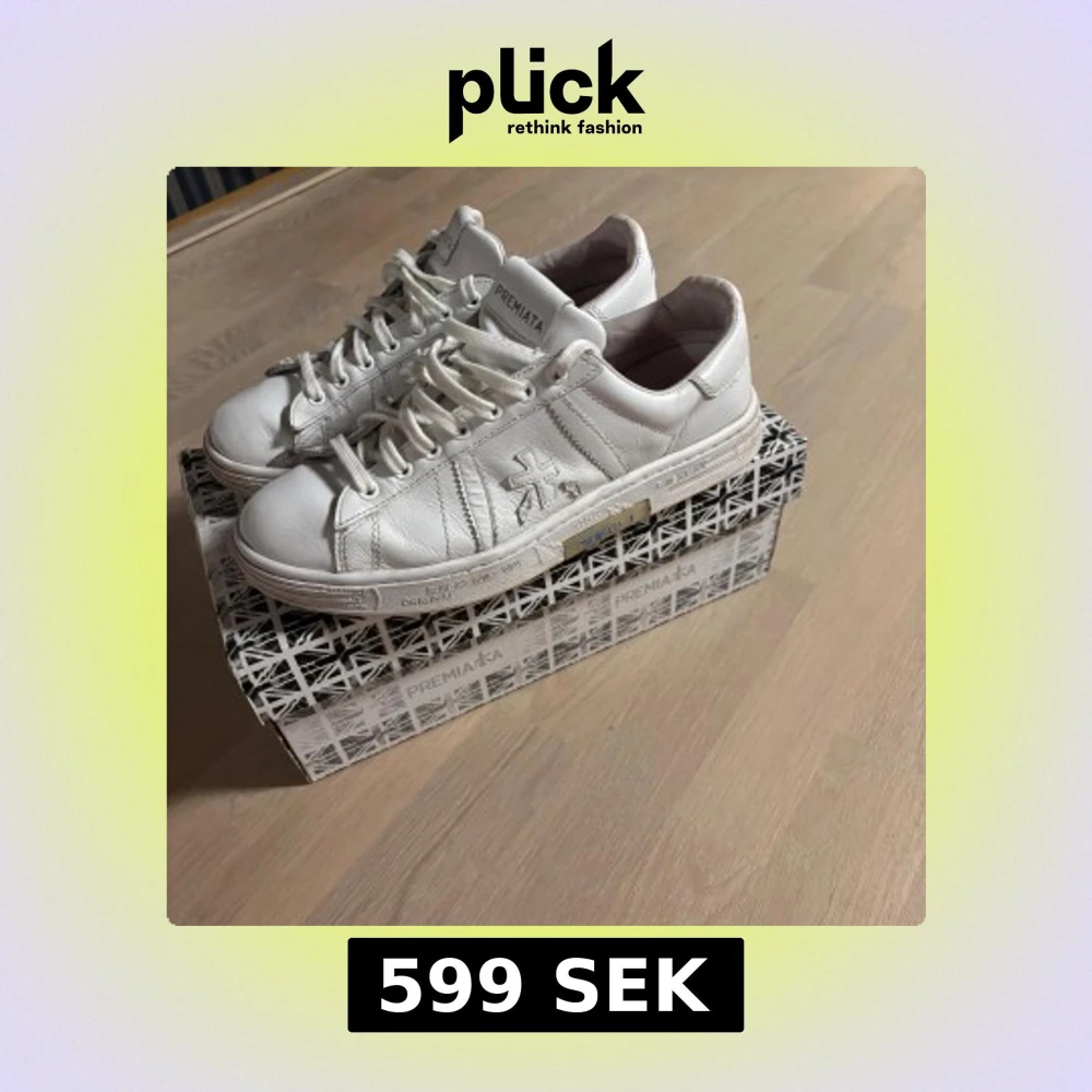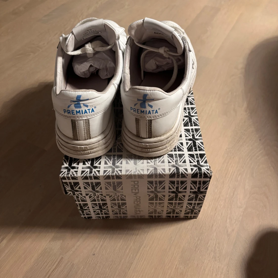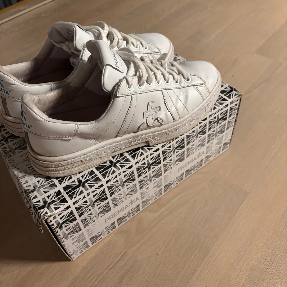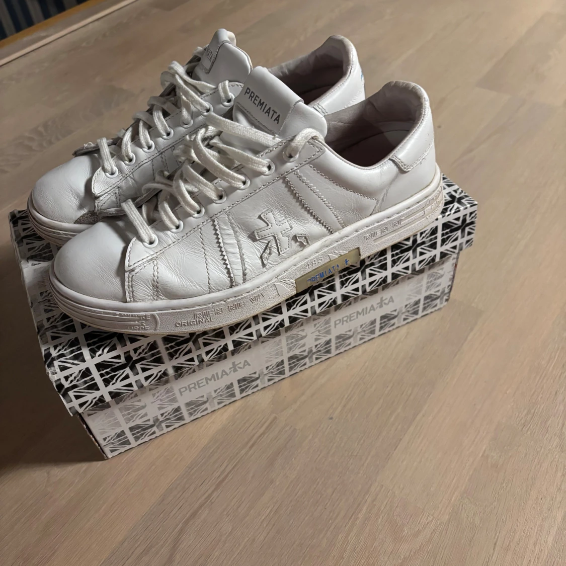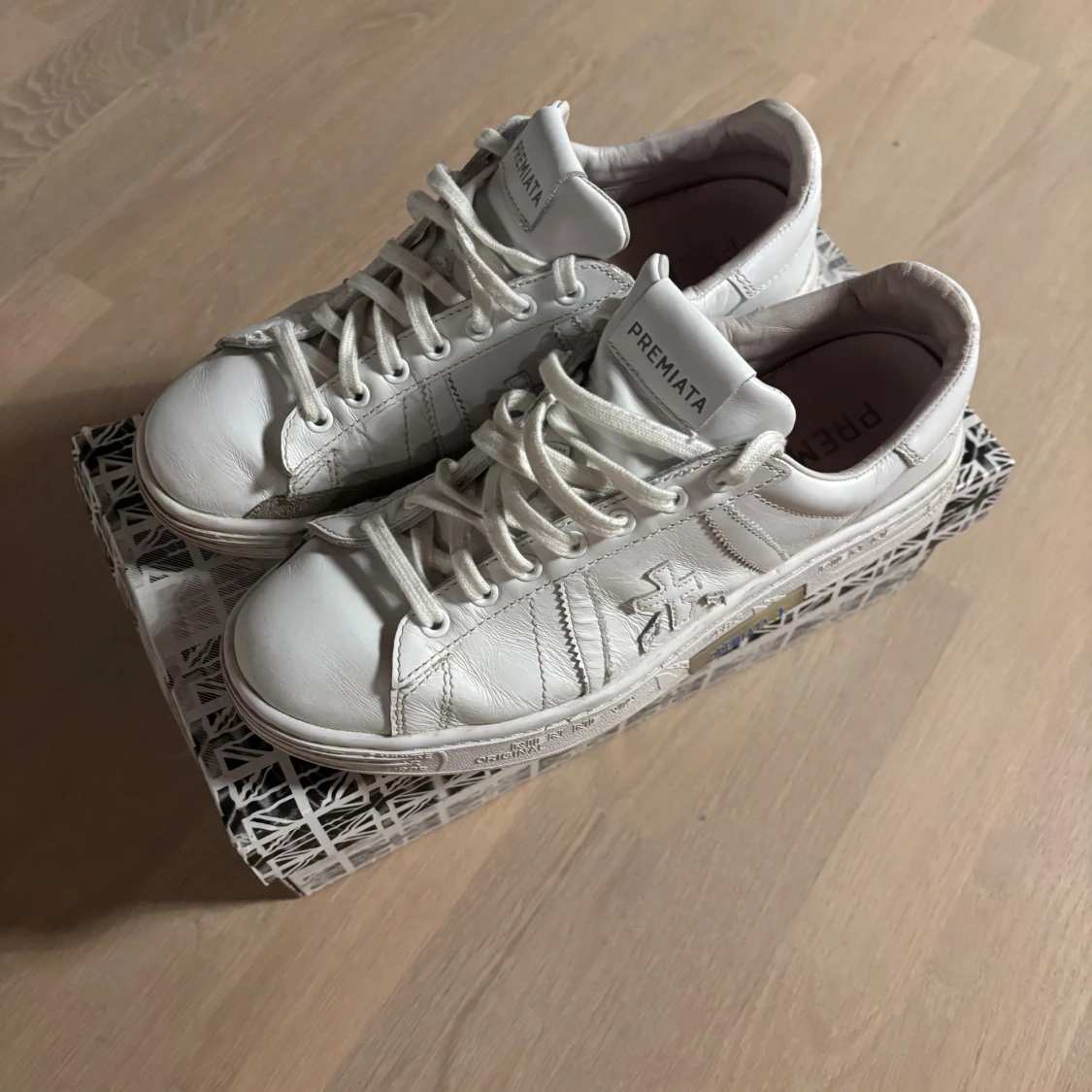 Snygga vita sneakers från Premiata i mjukt skinn med klassisk rund tå och snörning. Skorna har diskreta sömdetaljer, logga på sidan och blå Premiata-tryck på hälen. Perfekta för dig som gillar stilrena och trendiga sneakers. På den högra skon saknas en del så OBSERVERA det innan ni köper!
