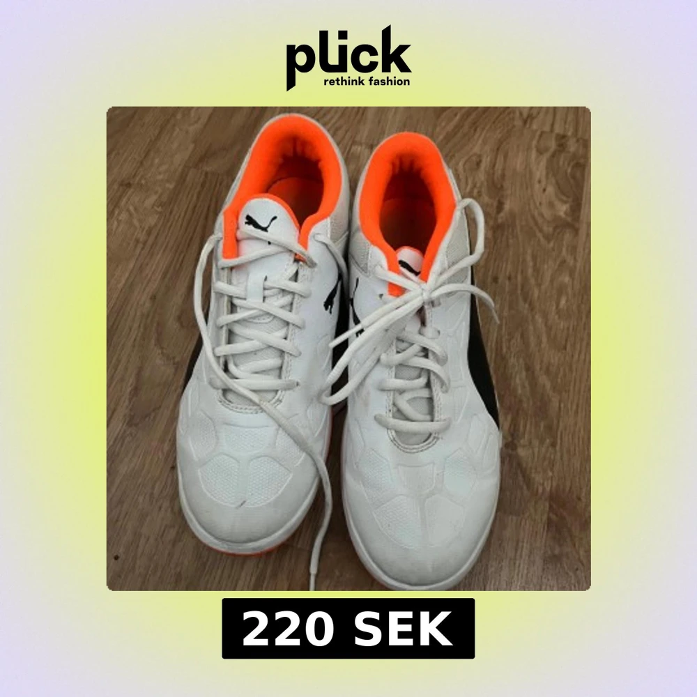 Säljer ett par vita Puma sneakers med svarta detaljer och en iögonfallande orange insida. Skorna har snörning och en sportig design, perfekt för en aktiv livsstil.