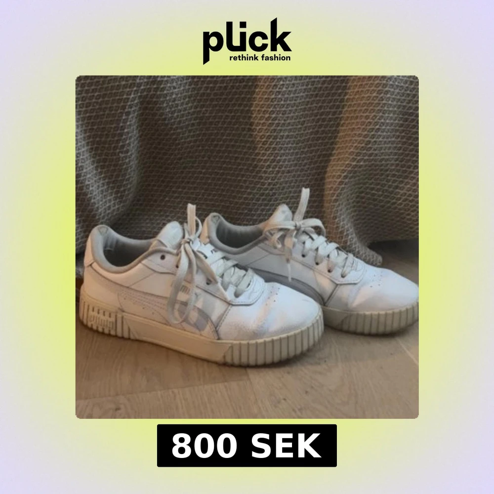 Säljer ett par vita sneakers från Puma med snörning och en robust sula. Skorna har en klassisk design med Pumas logga på hälen och sidan. Perfekta för en avslappnad stil.