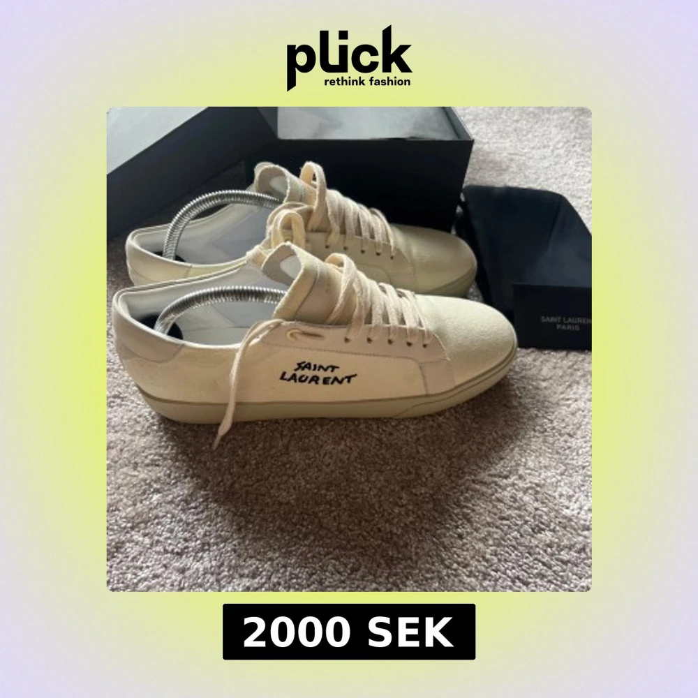 Säljer ett par stilrena vita sneakers från Saint Laurent med svart logga på sidan och diskret branding på häl och plös. Skorna har snörning och är tillverkade i canvas och skinn. Perfekta för dig som gillar minimalistisk design.