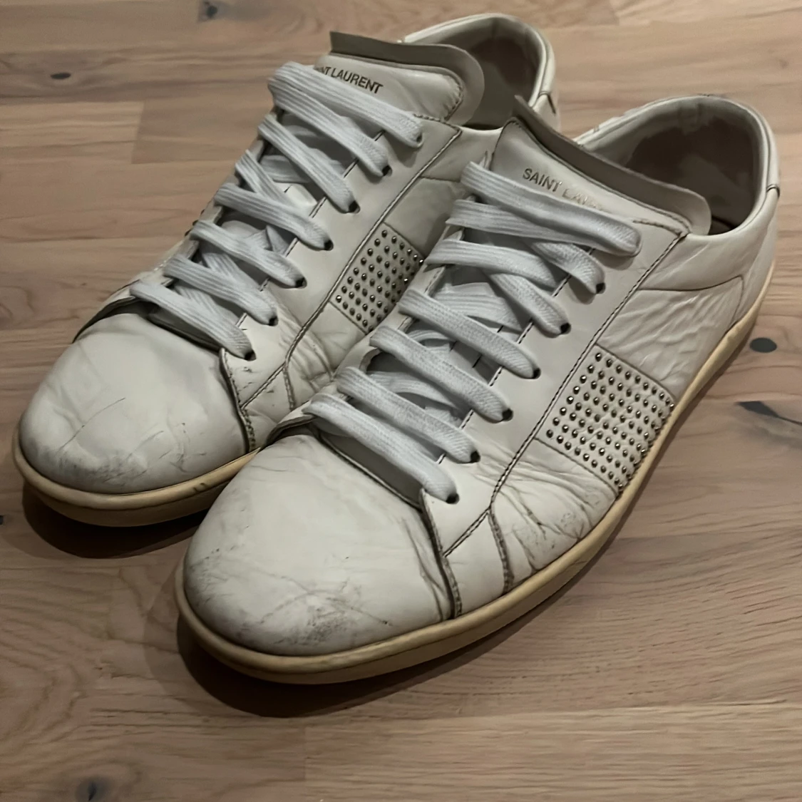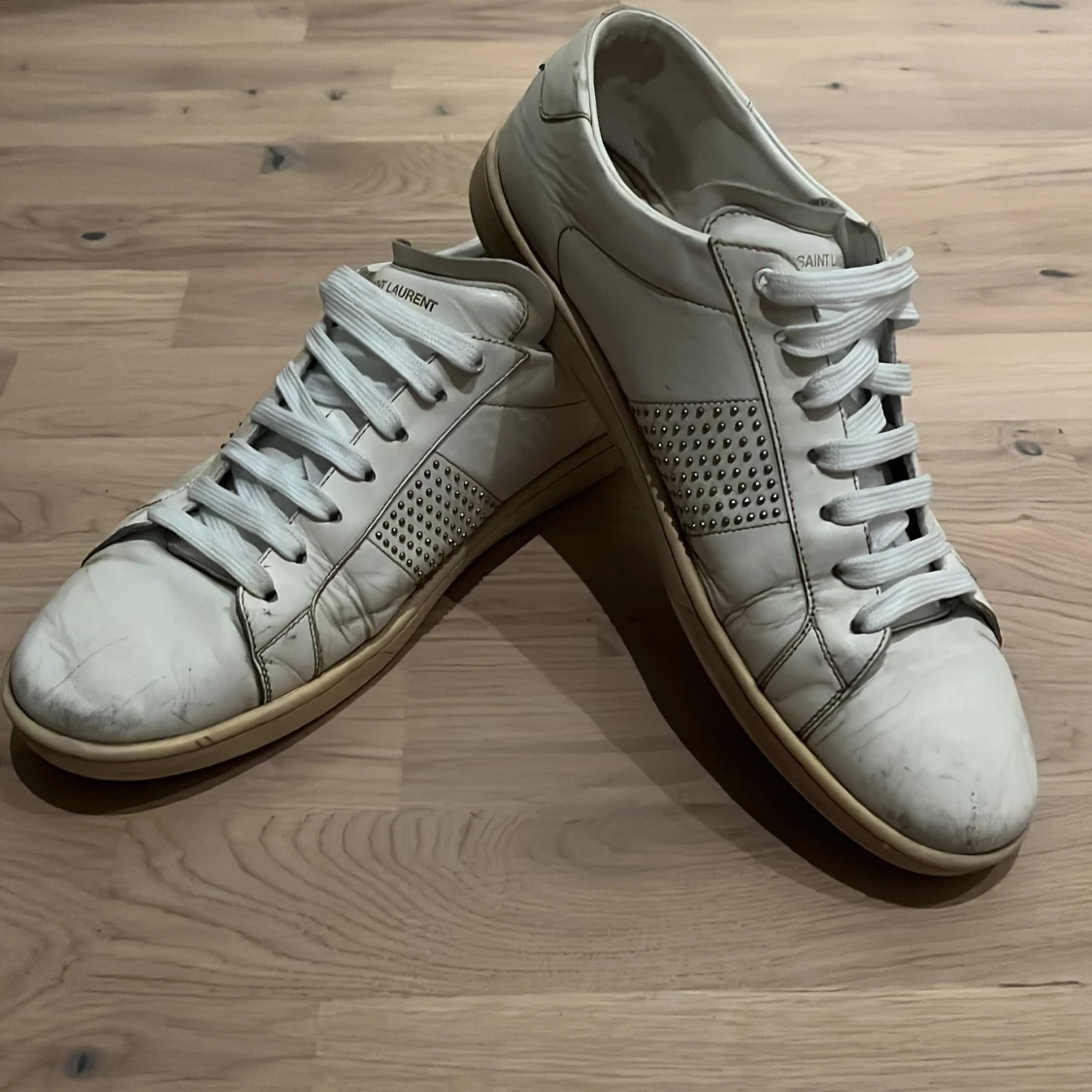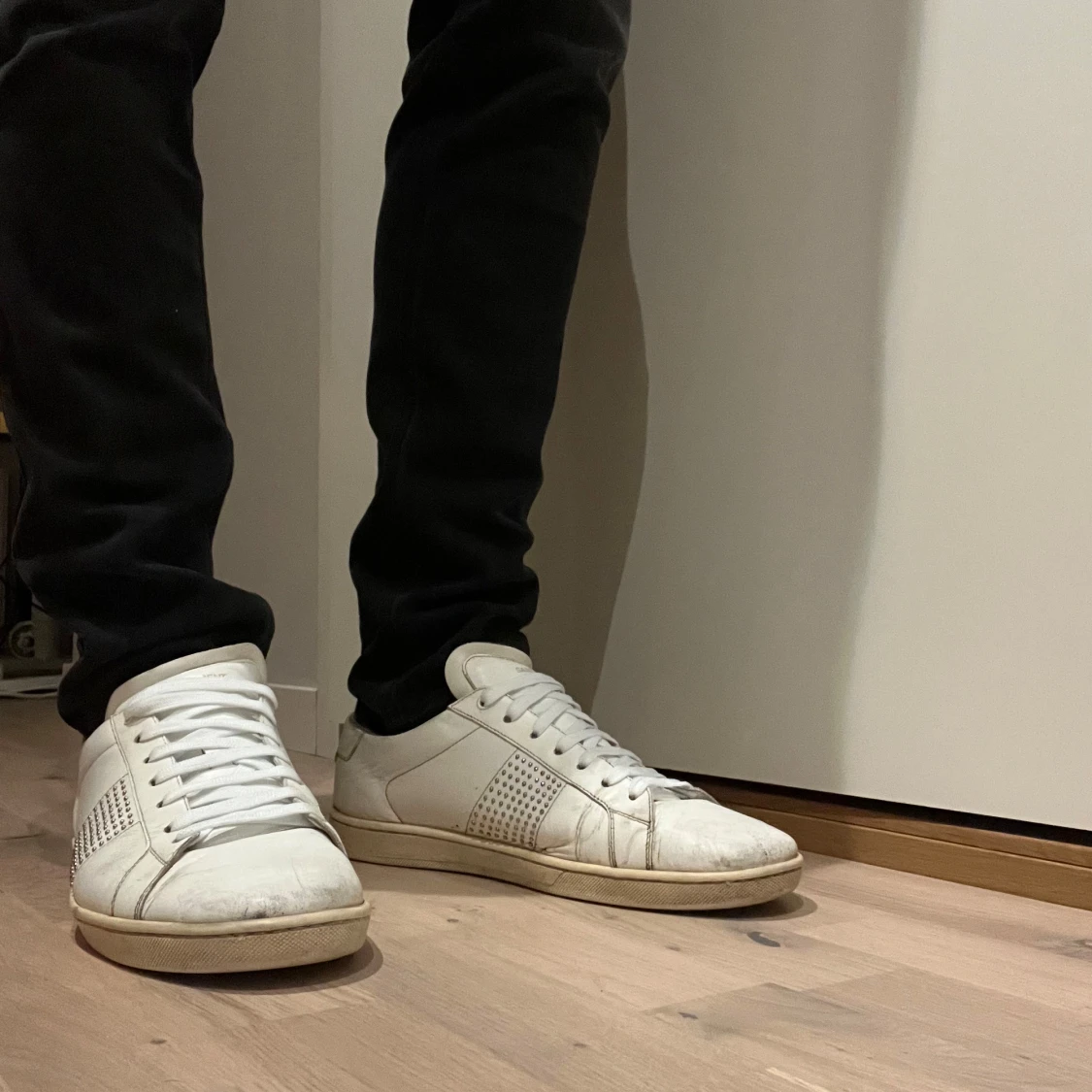 Snygga vita sneakers från Saint Laurent med klassisk snörning och perforerade detaljer på sidorna. Perfekta för en stilren look. Använda men inget som är sönder med de. Behövs bara en trasa och det är helt redo för att spränga stan 😝