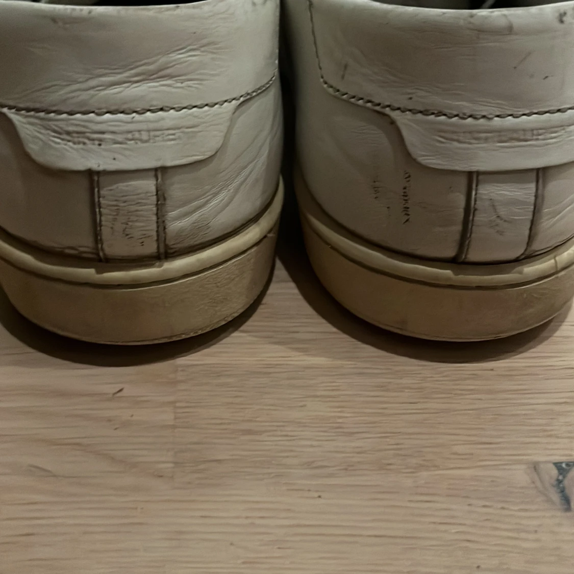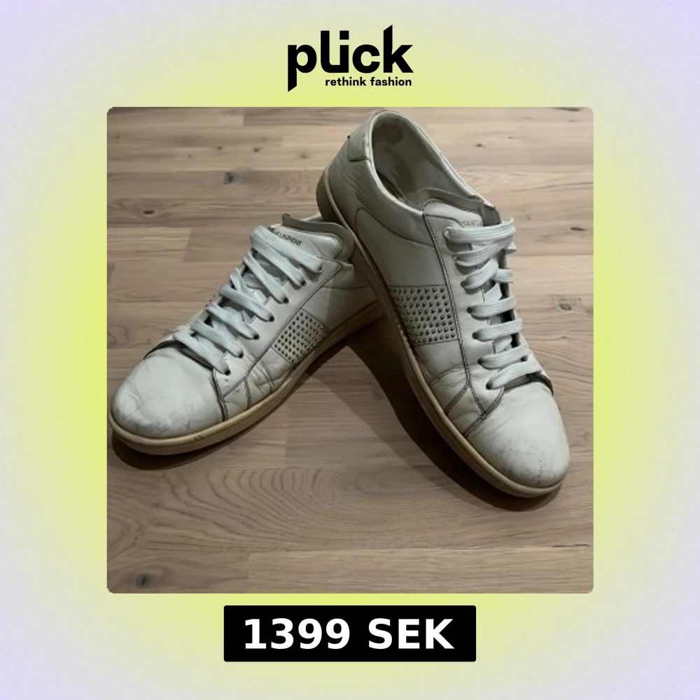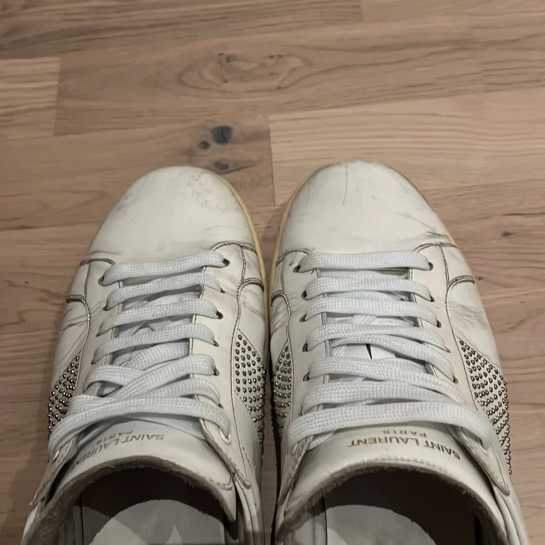 Snygga vita sneakers från Saint Laurent med klassisk snörning och perforerade detaljer på sidorna. Perfekta för en stilren look. Använda men inget som är sönder med de. Behövs bara en trasa och det är helt redo för att spränga stan 😝