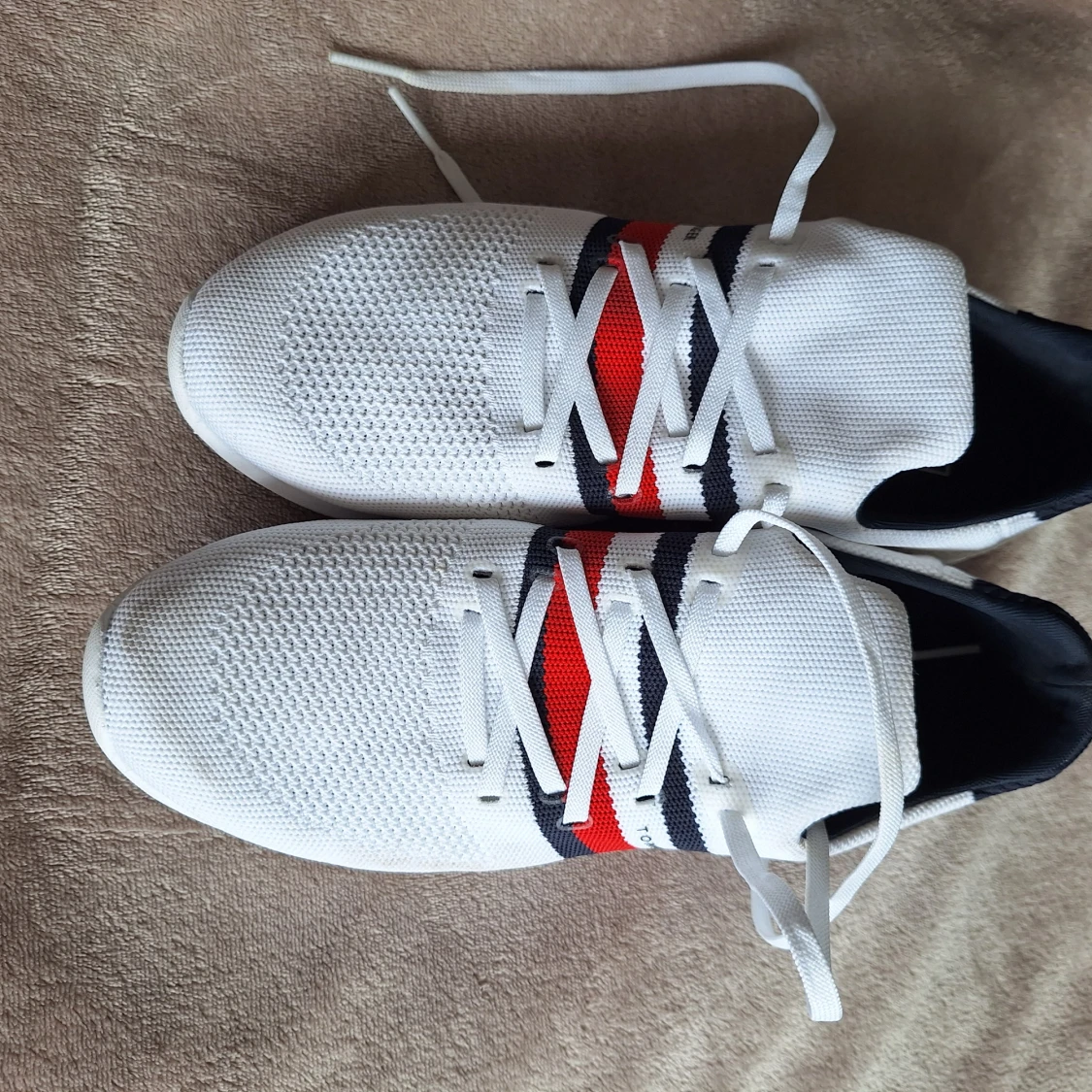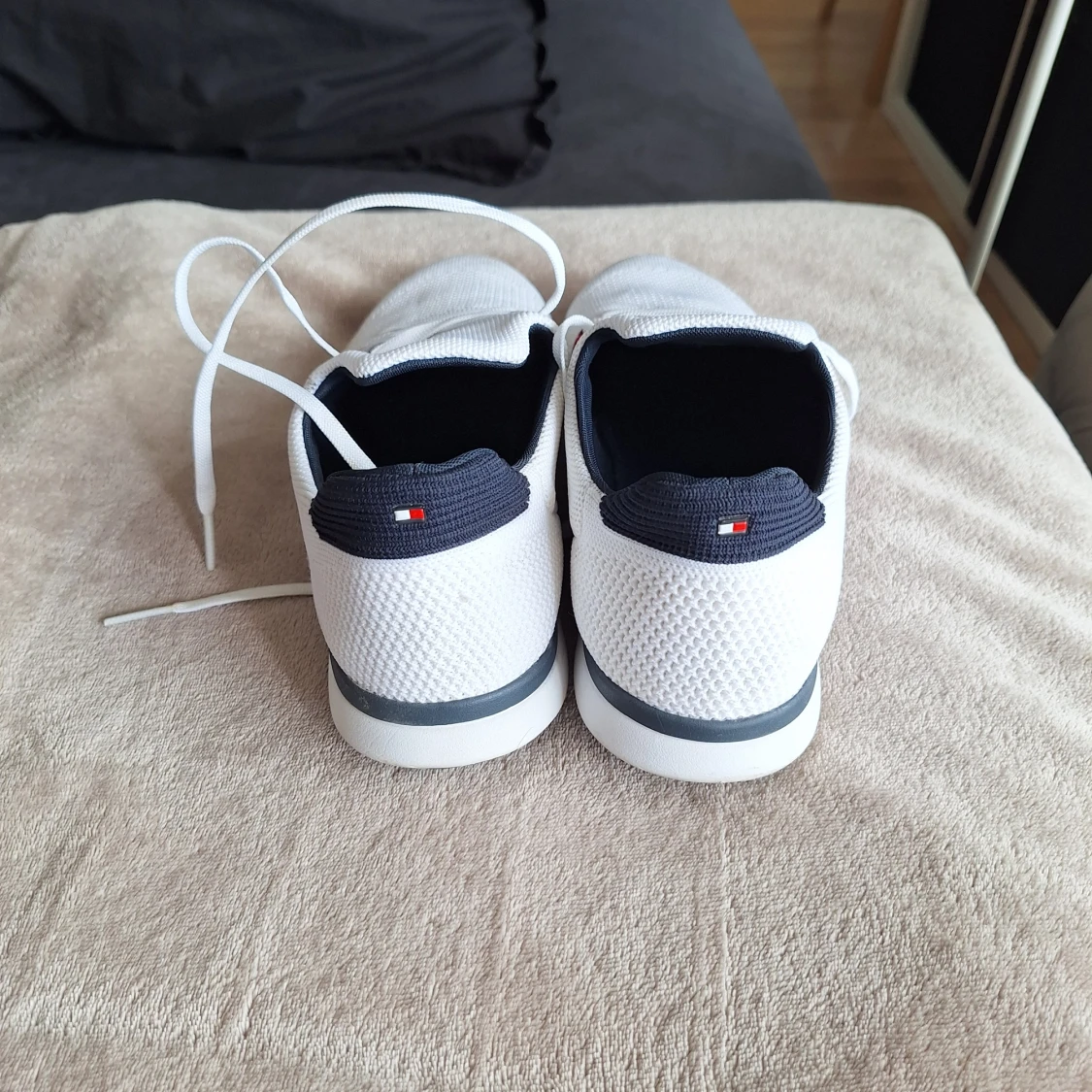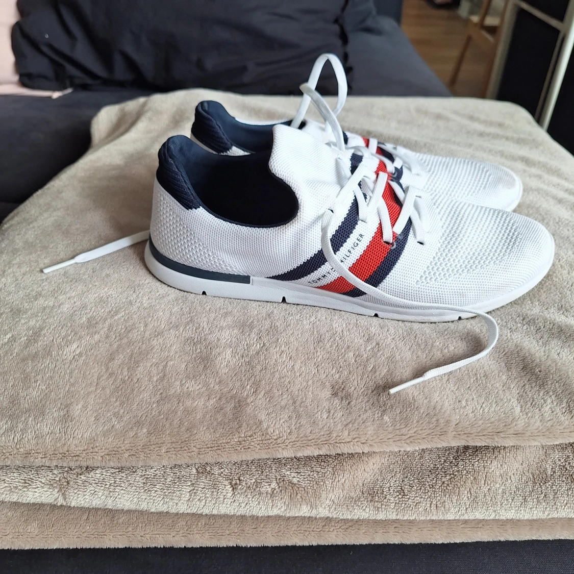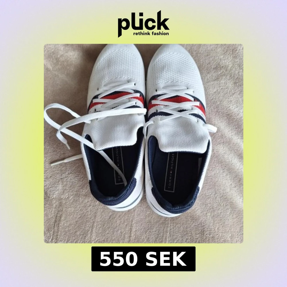 Snygga vita sneakers från Tommy Hilfiger med stickad ovandel och klassiska röda och marinblå ränder på sidan. Skorna har vita snören, rund tå och detaljer i marinblått vid hälen. Perfekta för en clean och sportig look.