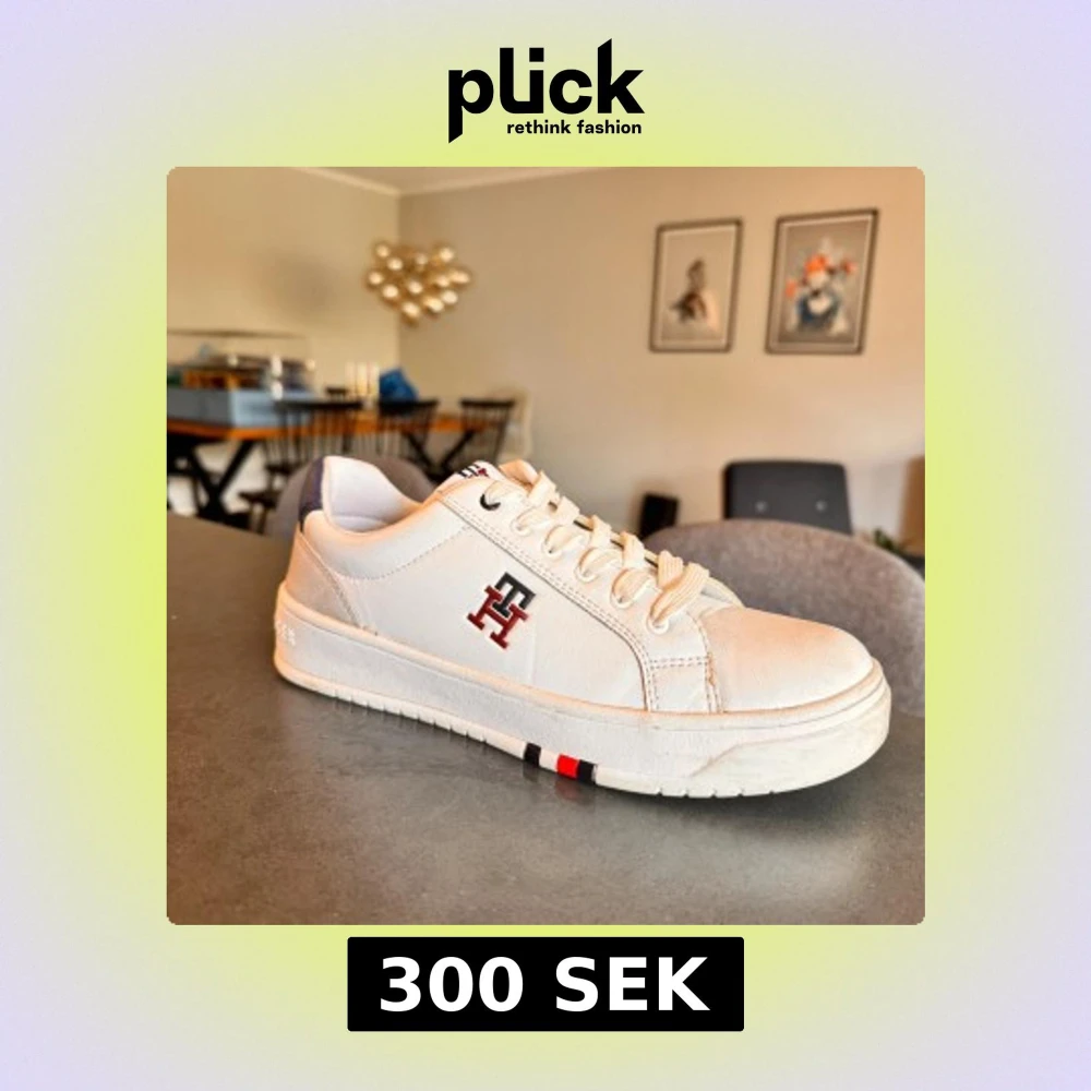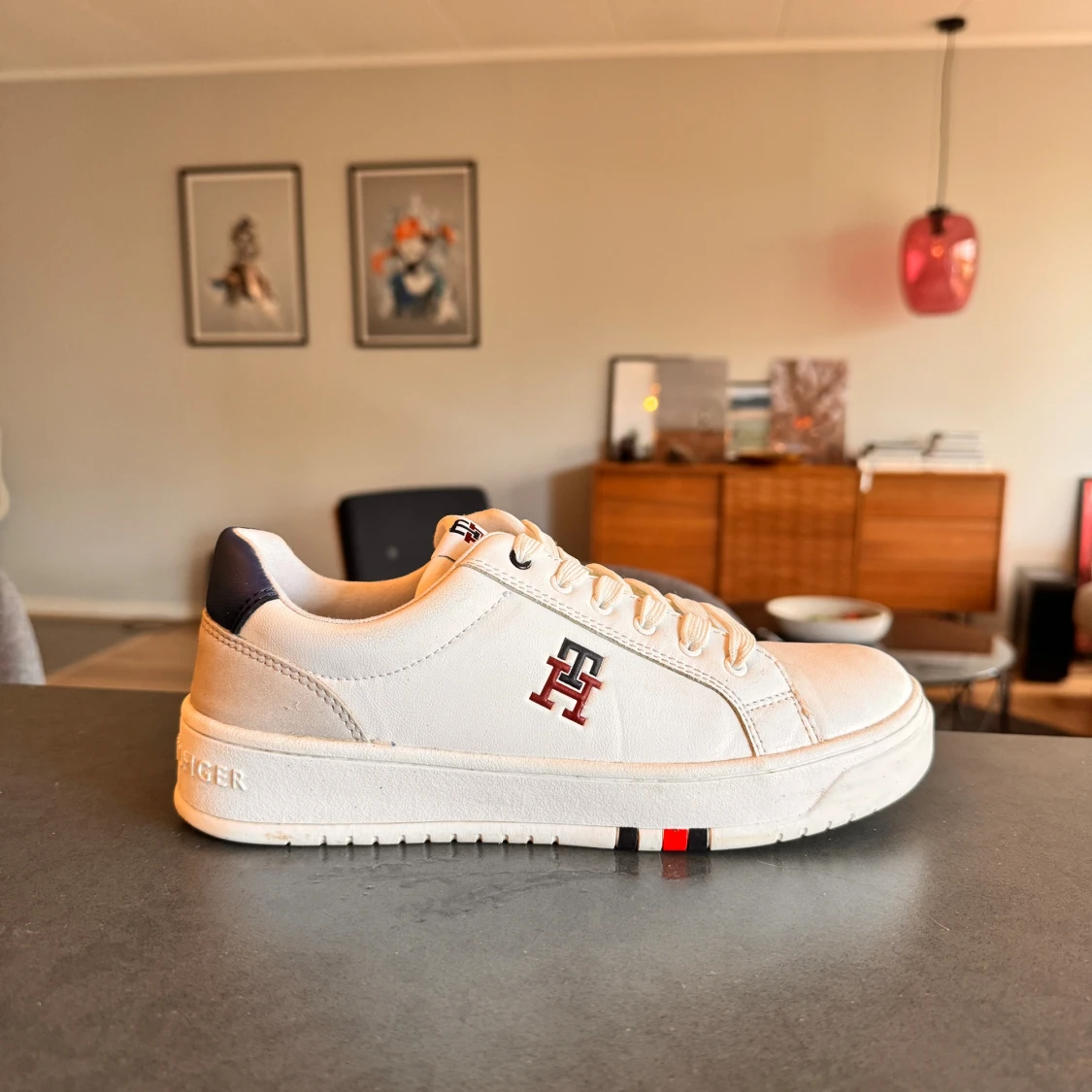 Snygga vita sneakers från Tommy Hilfiger med klassisk logga på sidan och detaljer i rött, blått och vitt. Skorna har snörning, platt sula och är tillverkade i läder. Perfekta för en clean och stilren look.