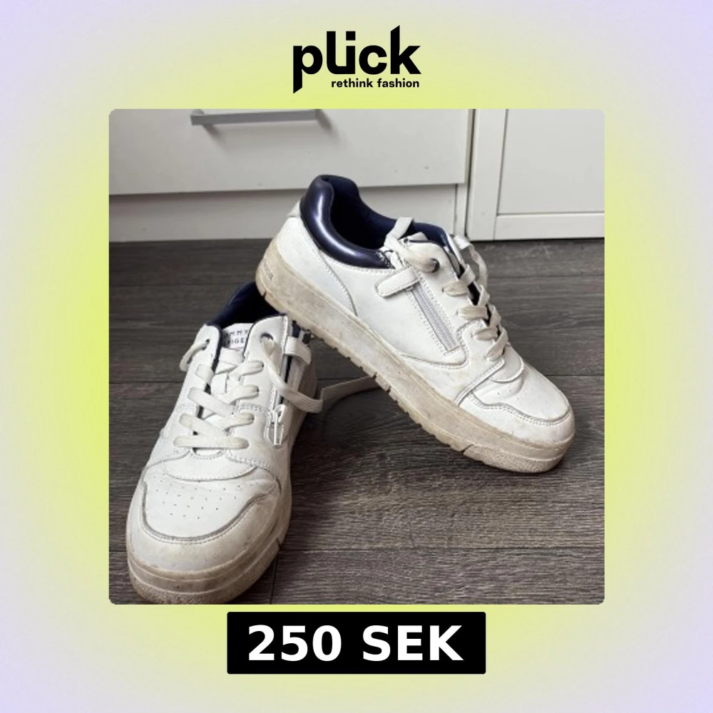 Snygga vita sneakers från Tommy Hilfiger med marinblå detaljer vid hälen. Skorna har snörning, dragkedja på sidan och en platt sula. Perfekta för dig som gillar en clean och sportig stil. Tillverkade i skinn och syntet.