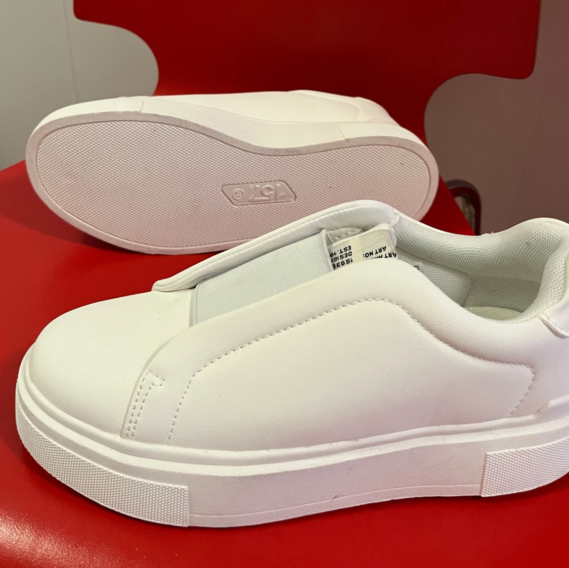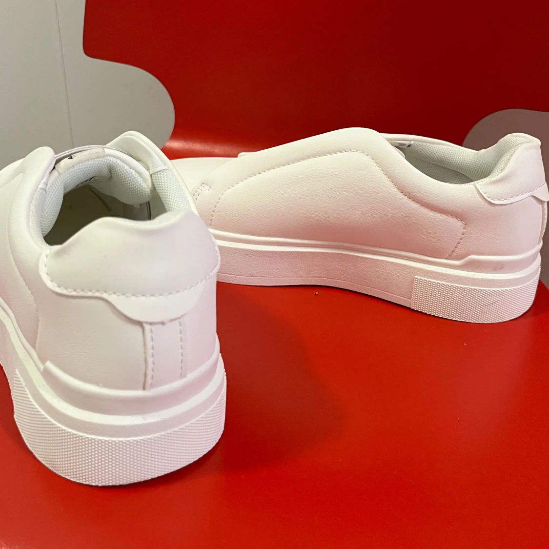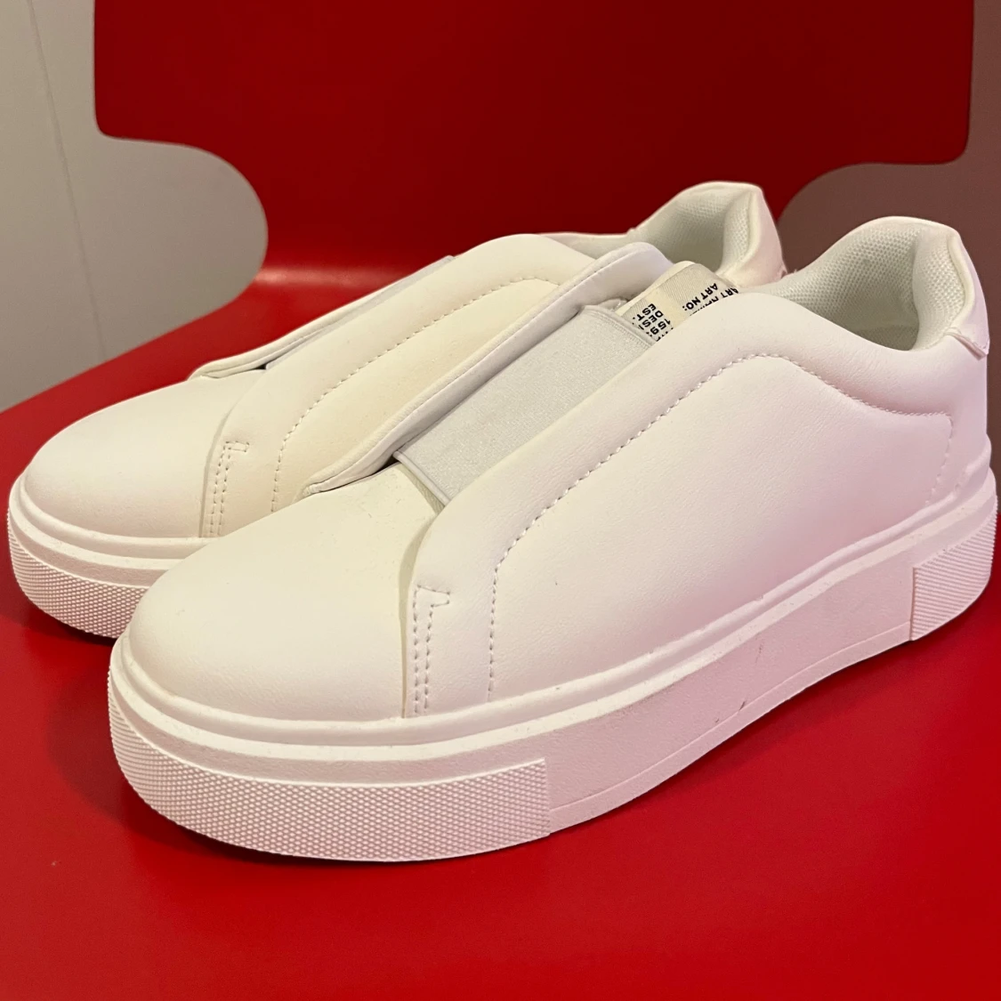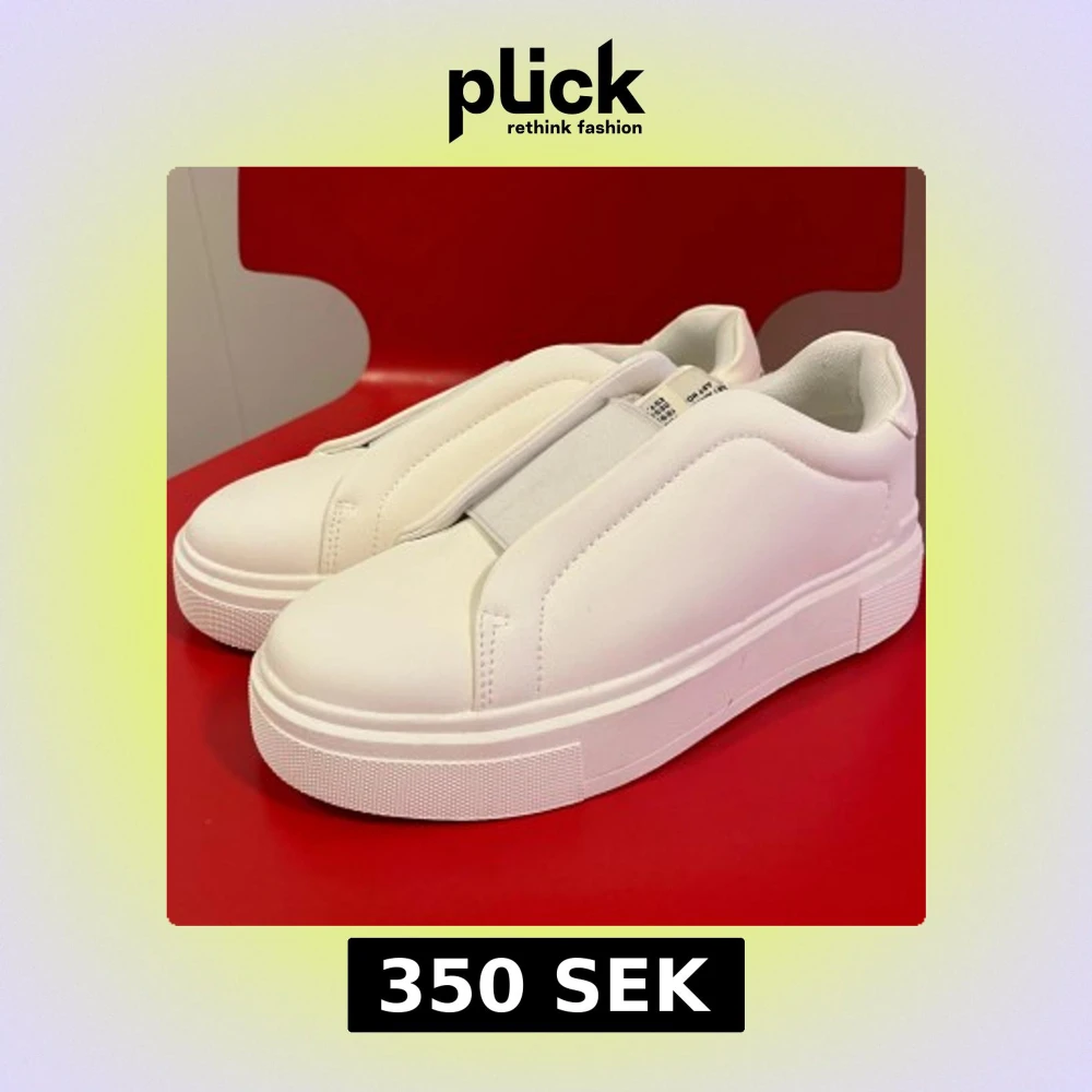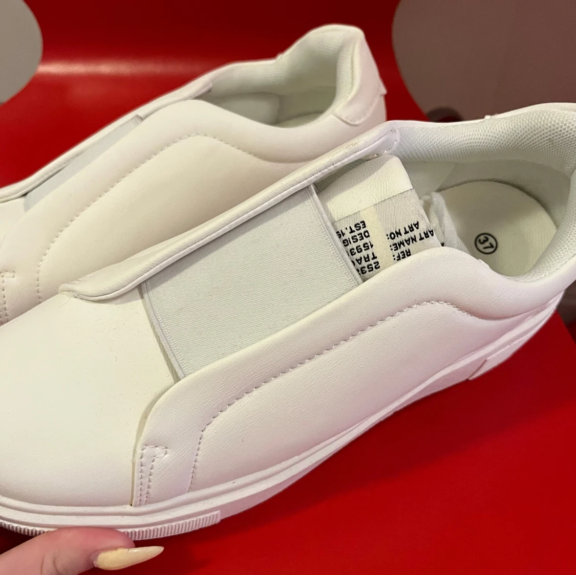 Säljer ett par stilrena vita sneakers med elastisk rem över vristen istället för klassisk snörning. Skorna har en chunky platt sula och är tillverkade i syntetmaterial med mjuk vadderad insida. Perfekt för dig som gillar minimalistisk och clean look. Endast testade men var tyvärr för stora för mig. Nypris 400kr säljer för 340kr
