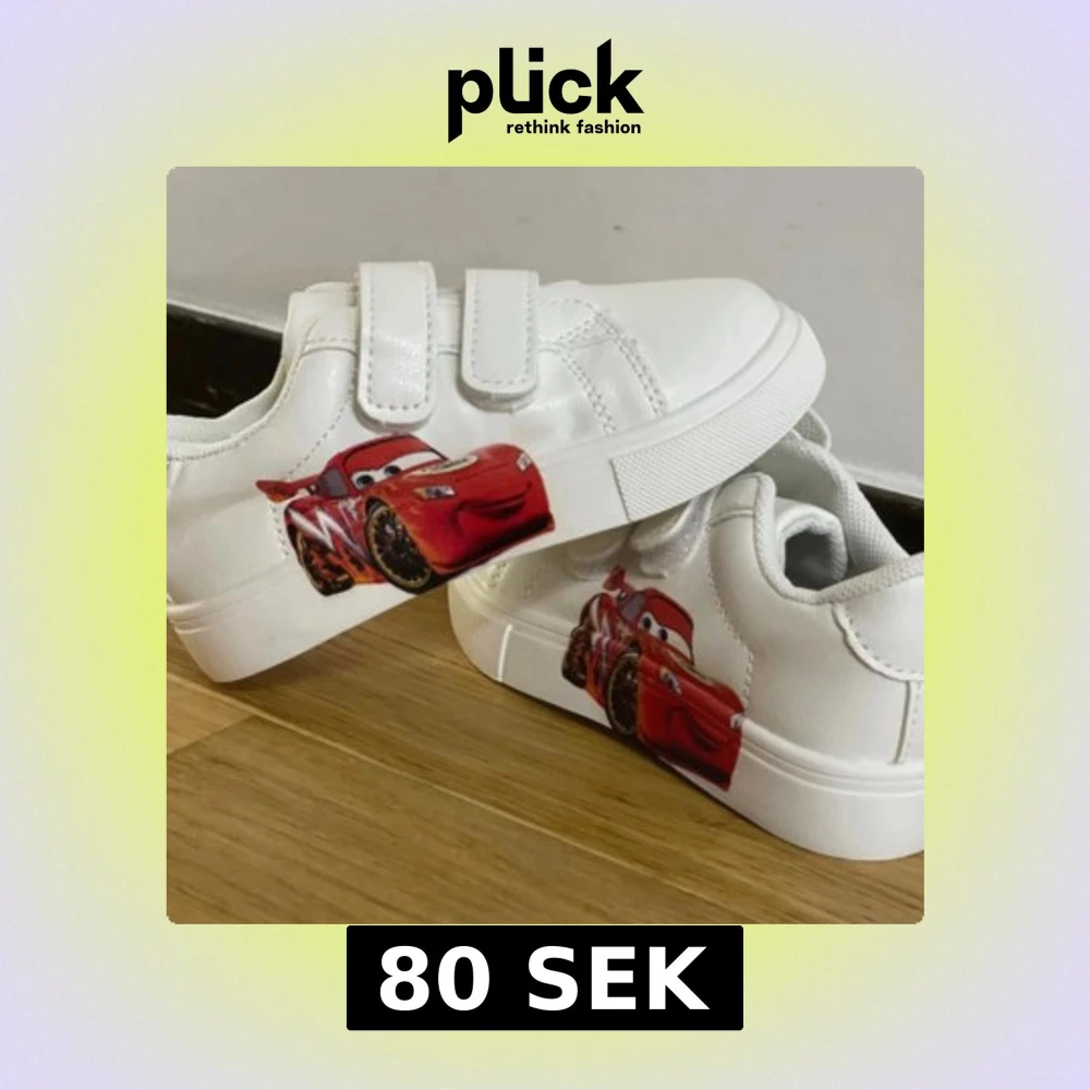 Snygga vita sneakers. motiv av Blixten McQueen från filmen Cars på sidan. Storlek 24